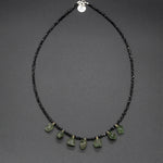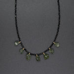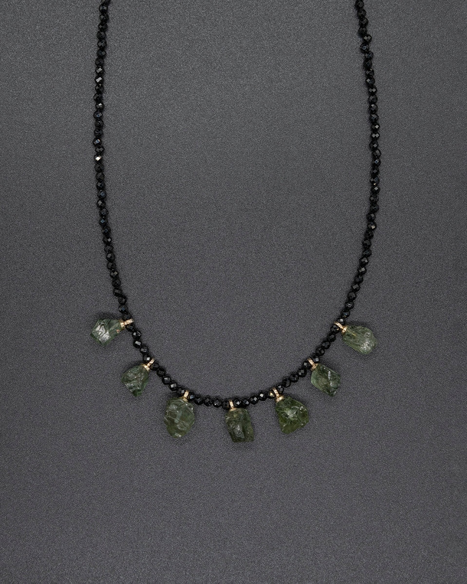 Featuring a row of raw green tourmaline drops delicately centered on a hand-beaded black spinel necklace, this piece channels natural beauty. Let the vibrant energy of tourmaline rejuvenate your spirit, ignite your creativity, and help you tackle challenges with ease.
