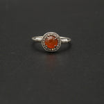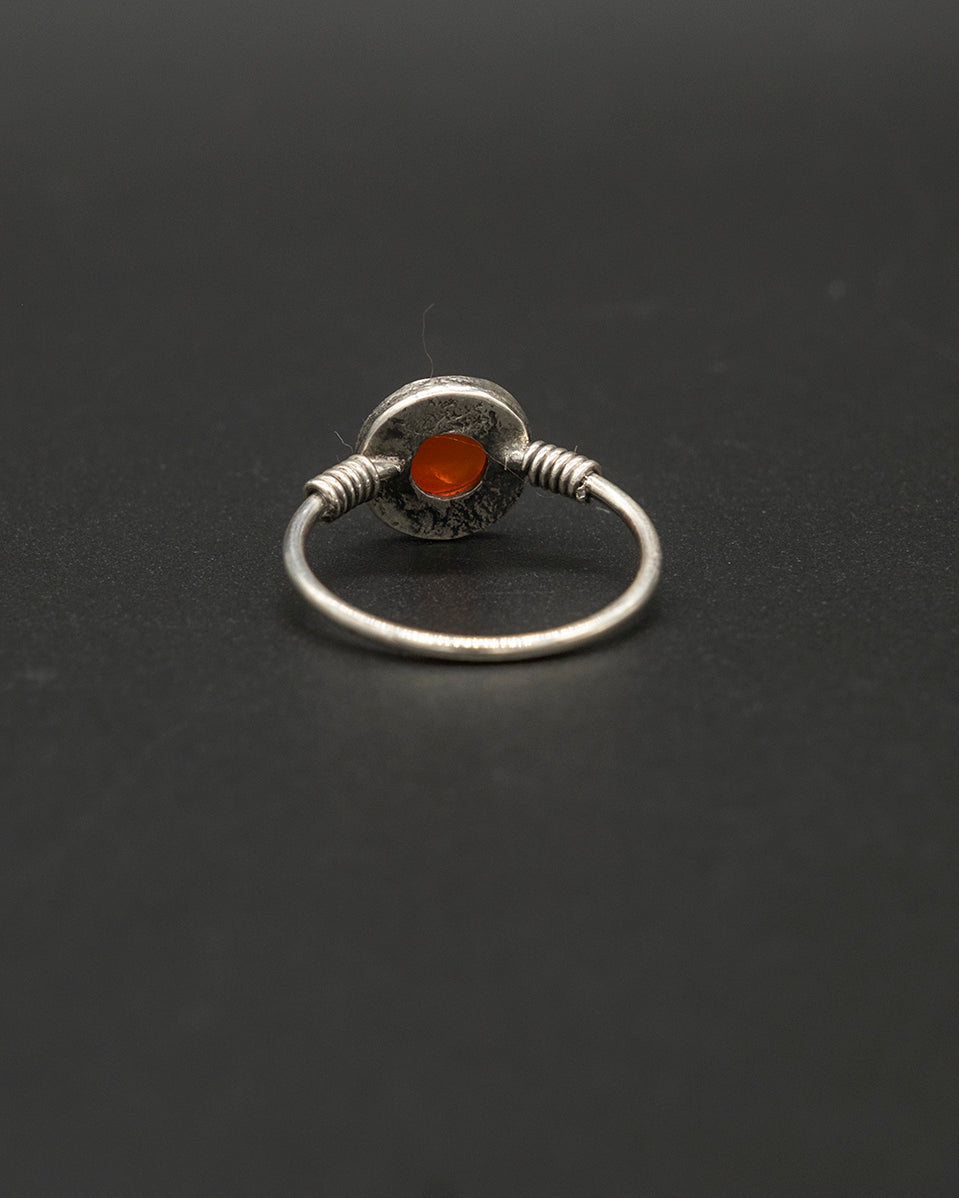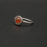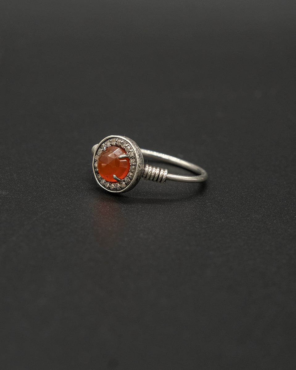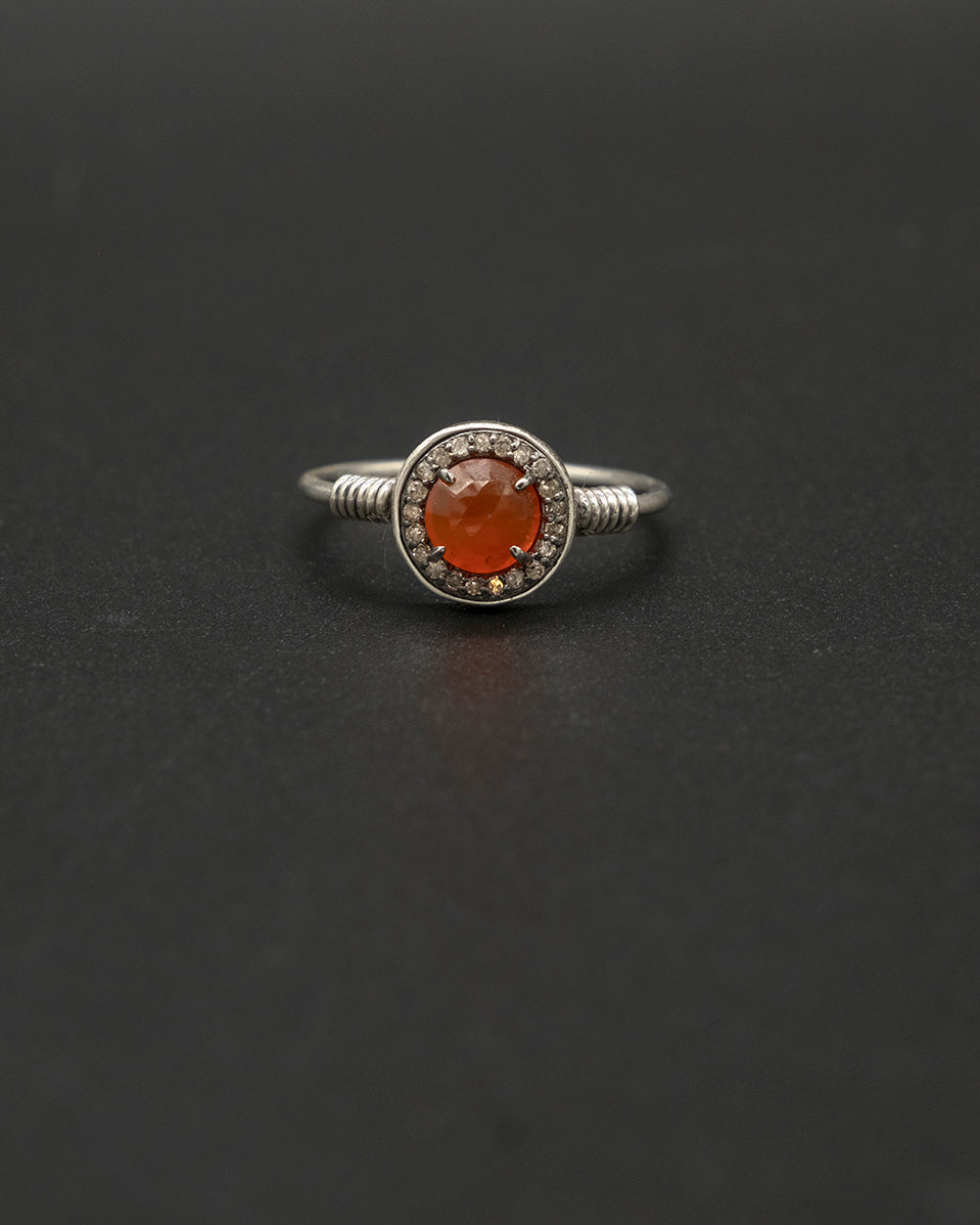 A warm carnelian accented with sparkling diamonds in hand-textured silver. The rich red-orange stone and delicate diamond highlights create a piece that is both bold and refined, radiating timeless energy.