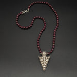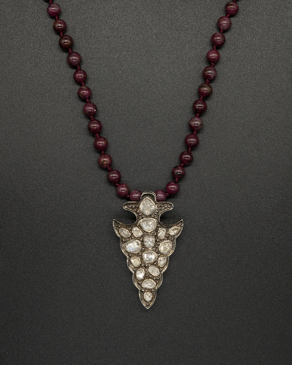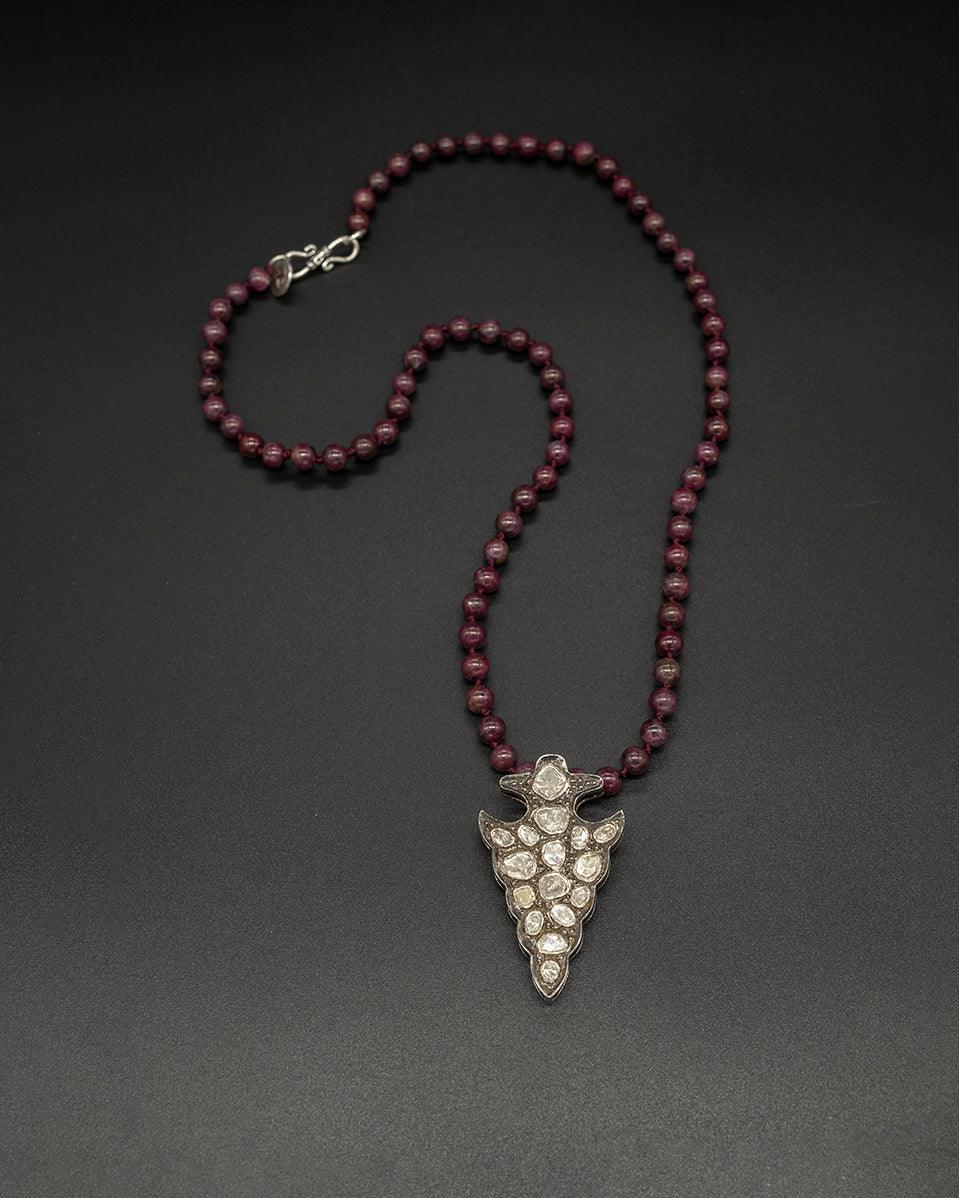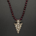 A sleek silver arrow set with shimmering diamond accents, paired with rich African ruby beads along the chain. A striking blend of clarity, direction, and bold red energy—crafted for a look that’s powerful, refined, and full of intention.