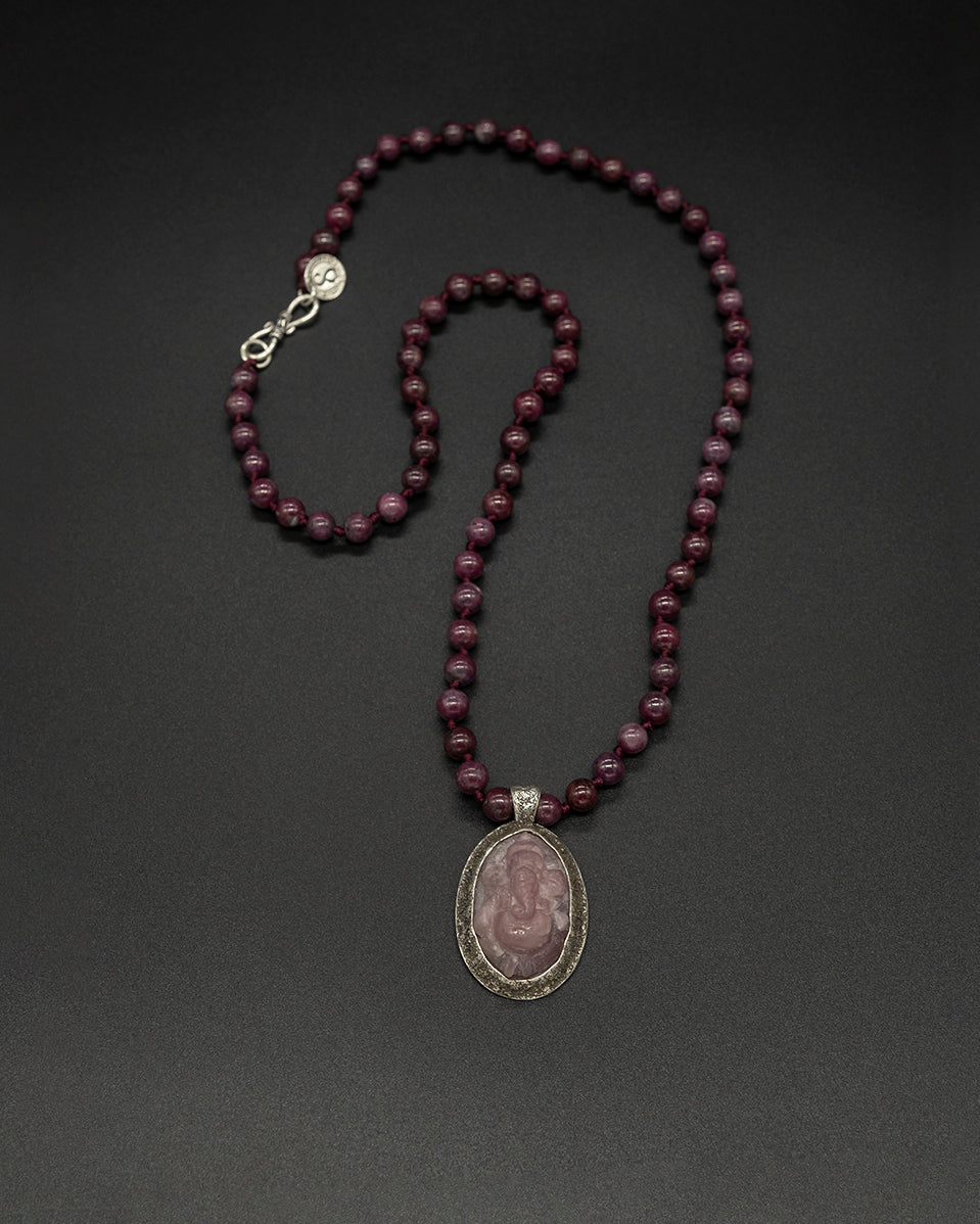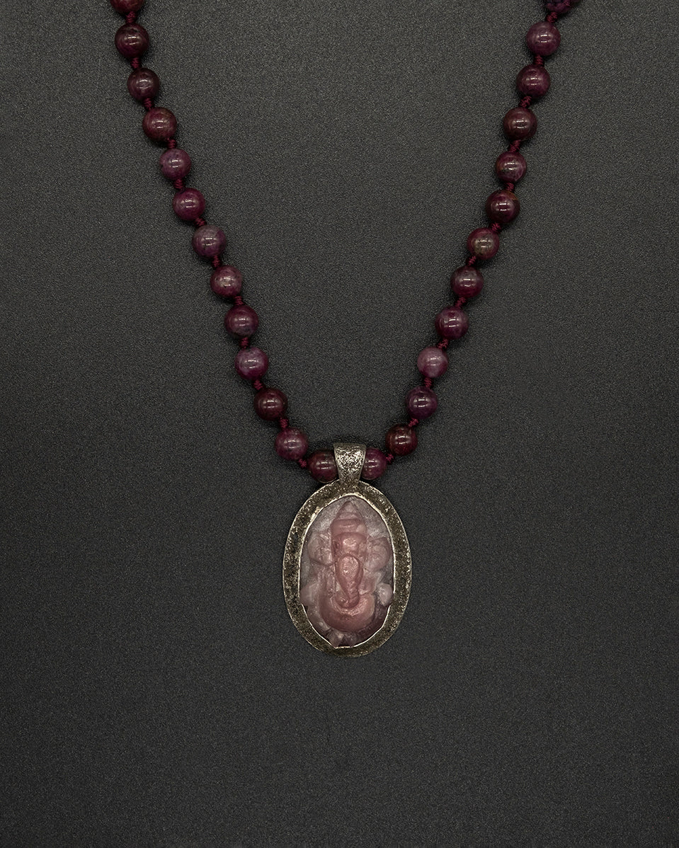 A finely carved ruby Ganesha set in a silver-dusted frame, paired with an African ruby bead chain.