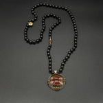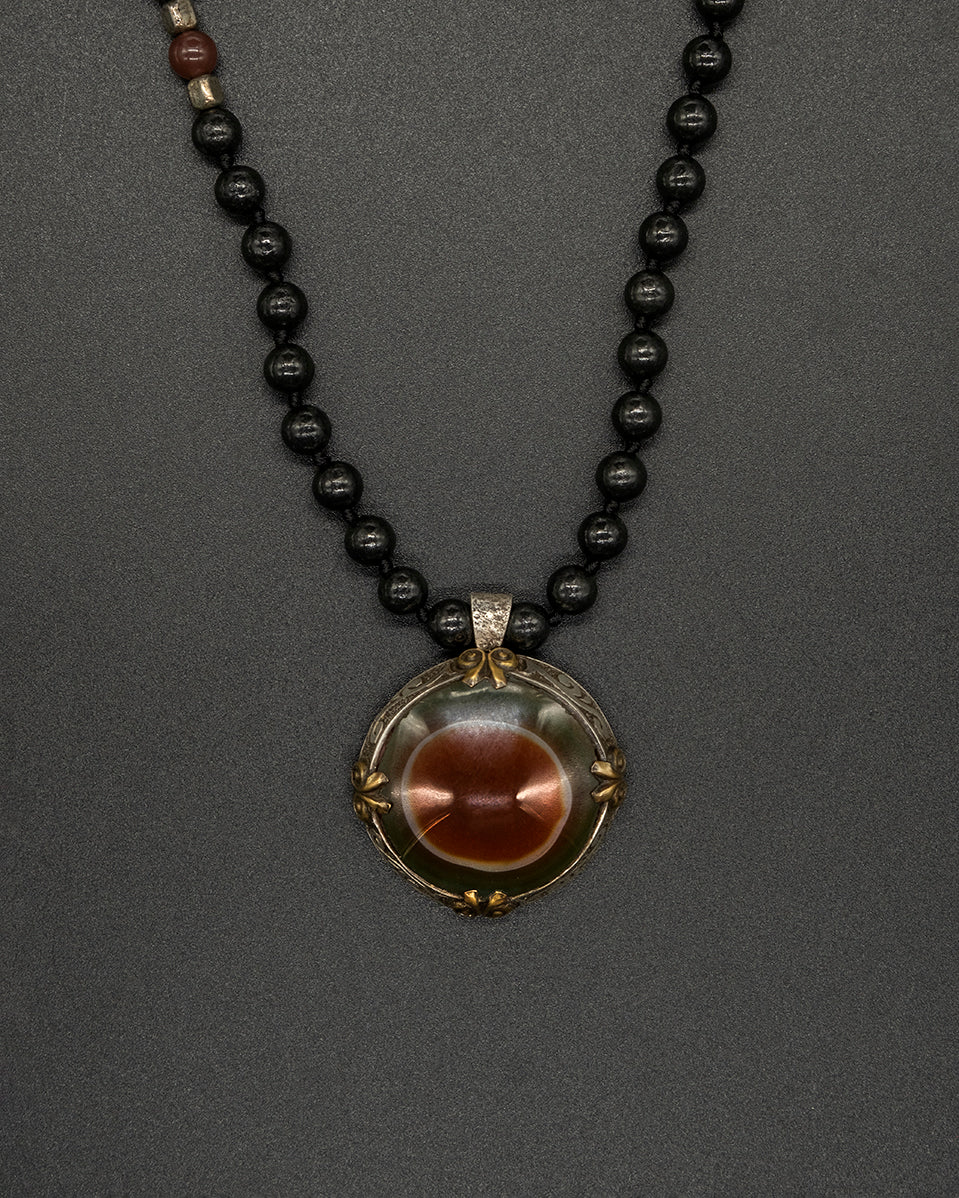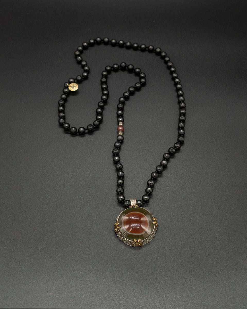 This necklace features a distinctive Green Suleimani agate centerpiece. Paired with a shungite chain, it brings earthy depth, contrast, and a refined, natural character.