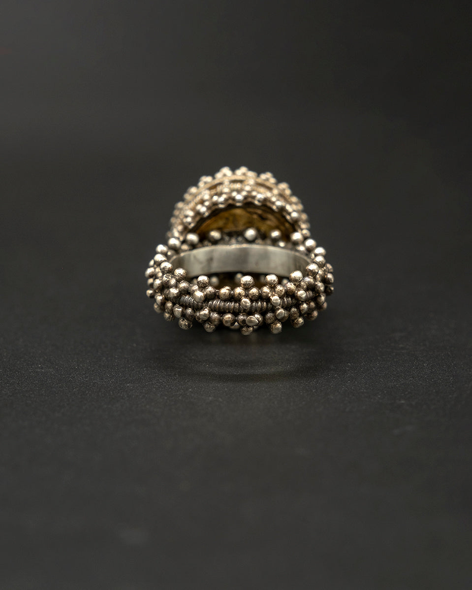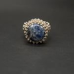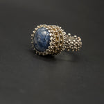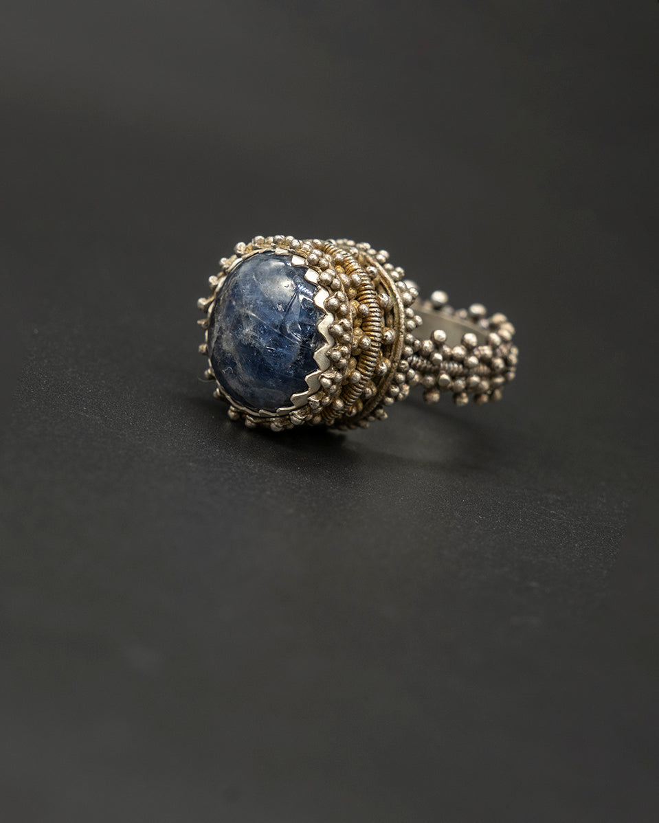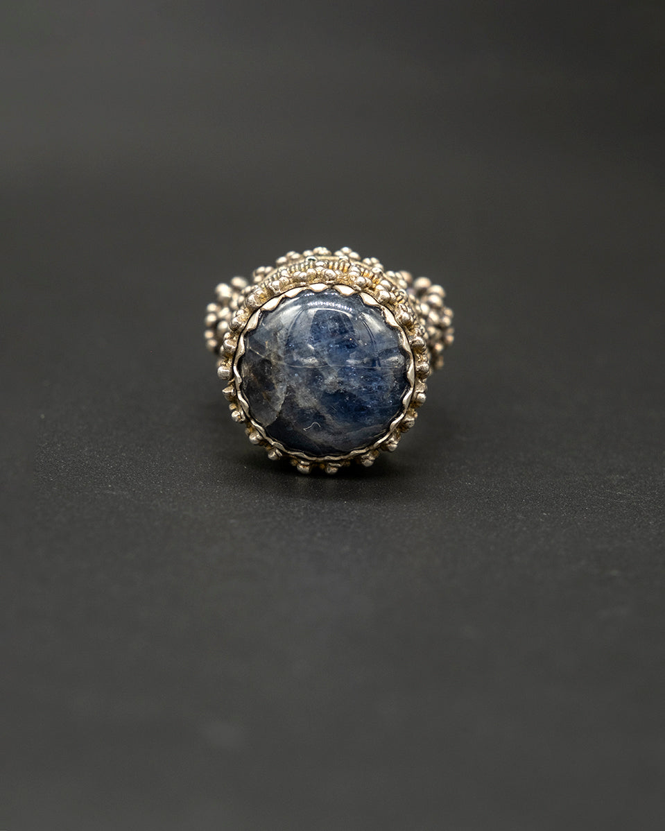 A vintage silver ring featuring a round Burma sapphire, its deep blue glow framed by textured silver. The classic design evokes heritage and timeless elegance, creating a piece full of character, charm, and understated luxury.