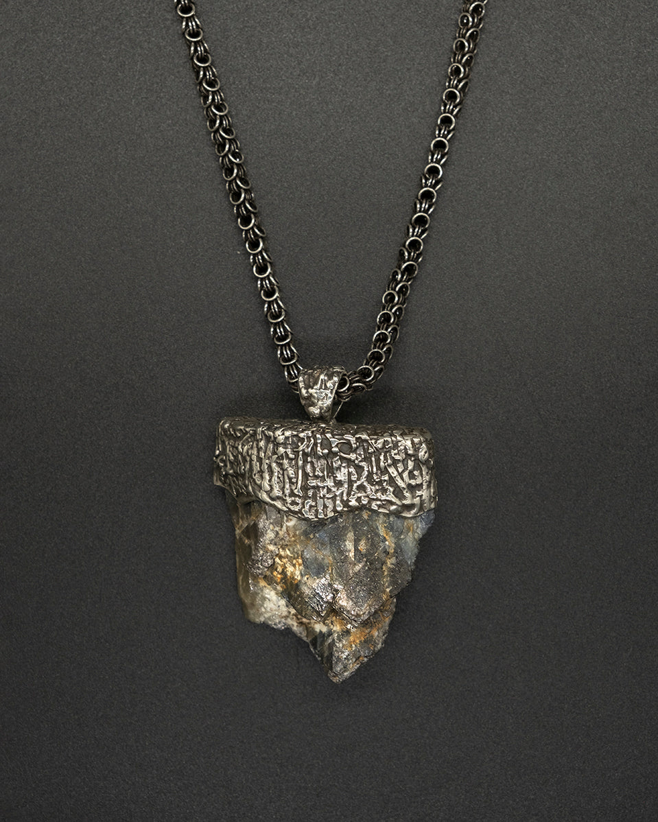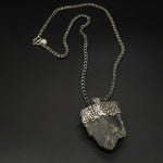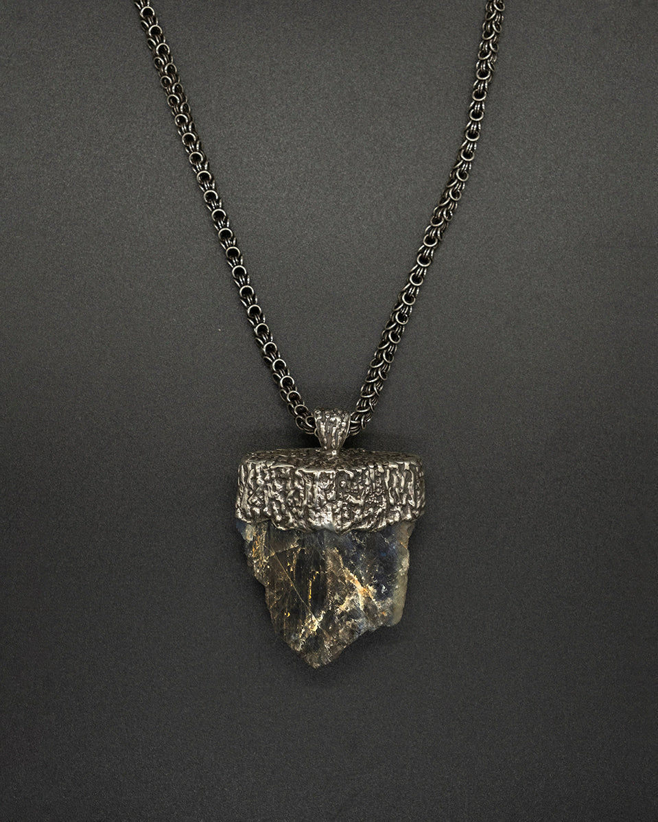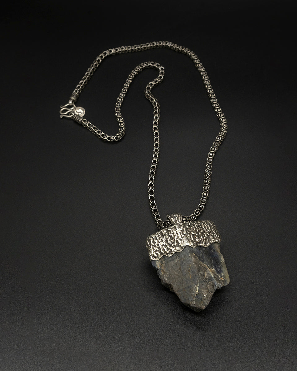 A deep blue raw-cut Burma sapphire set along a textured silver chain. Natural, striking, and elegantly rugged—this piece combines raw beauty with refined craftsmanship for a timeless, sophisticated look.