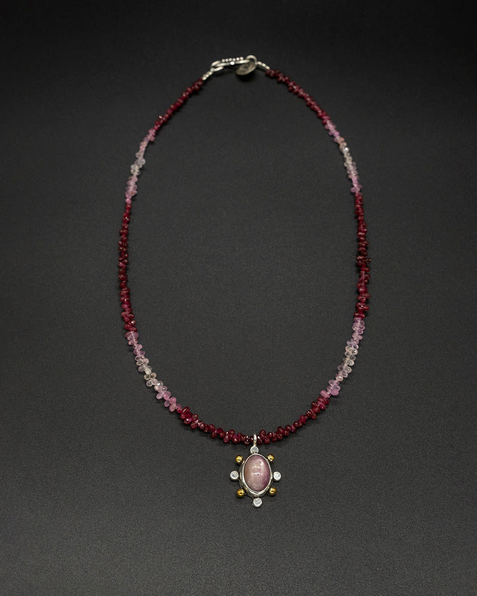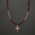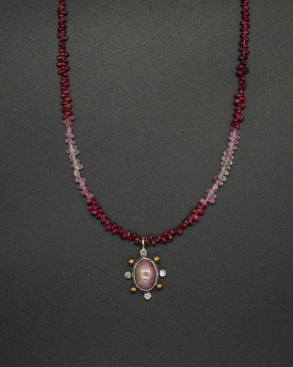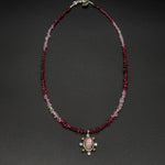 A silver and brass ruby pendant paired with ruby shaded beads from Burma.
