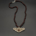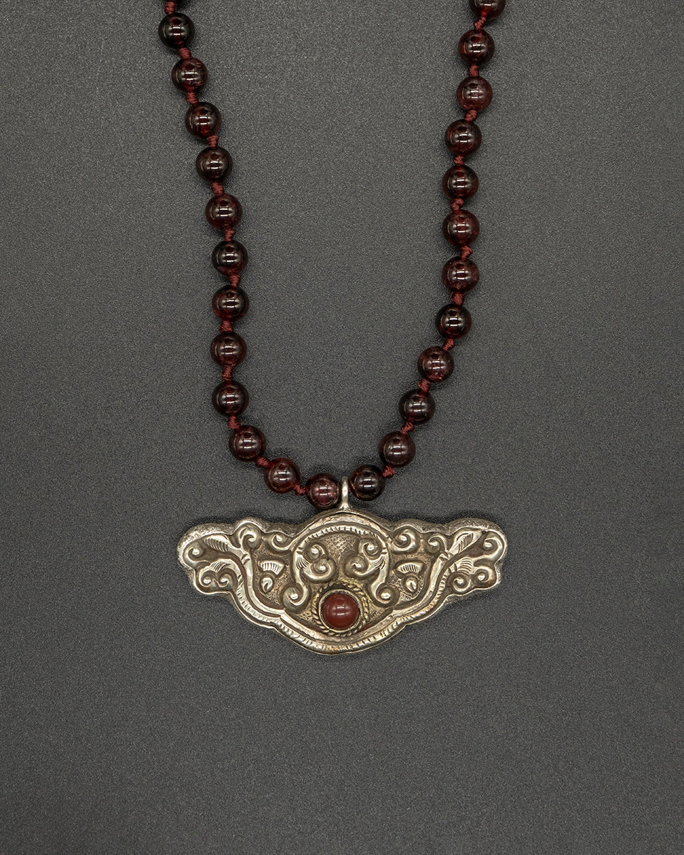 Behold the Garnet Queen, synonymous with regal elegance and unequaled craftsmanship. Its heart showcases a vintage silver Nepalese pendant. Paired with a hand-knotted garnet chain, the piece resonates with an enchanting fusion of antiquity and grace.