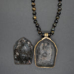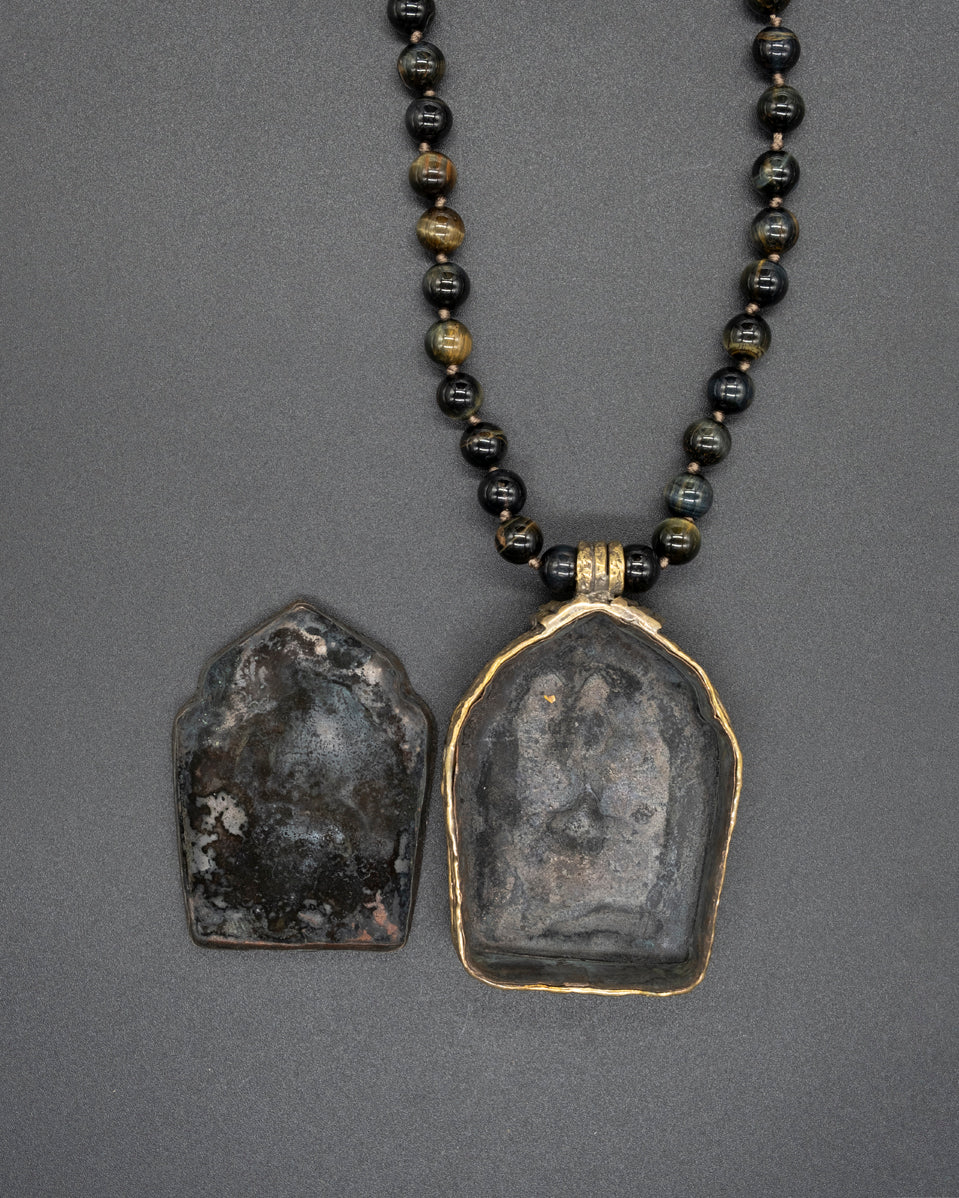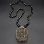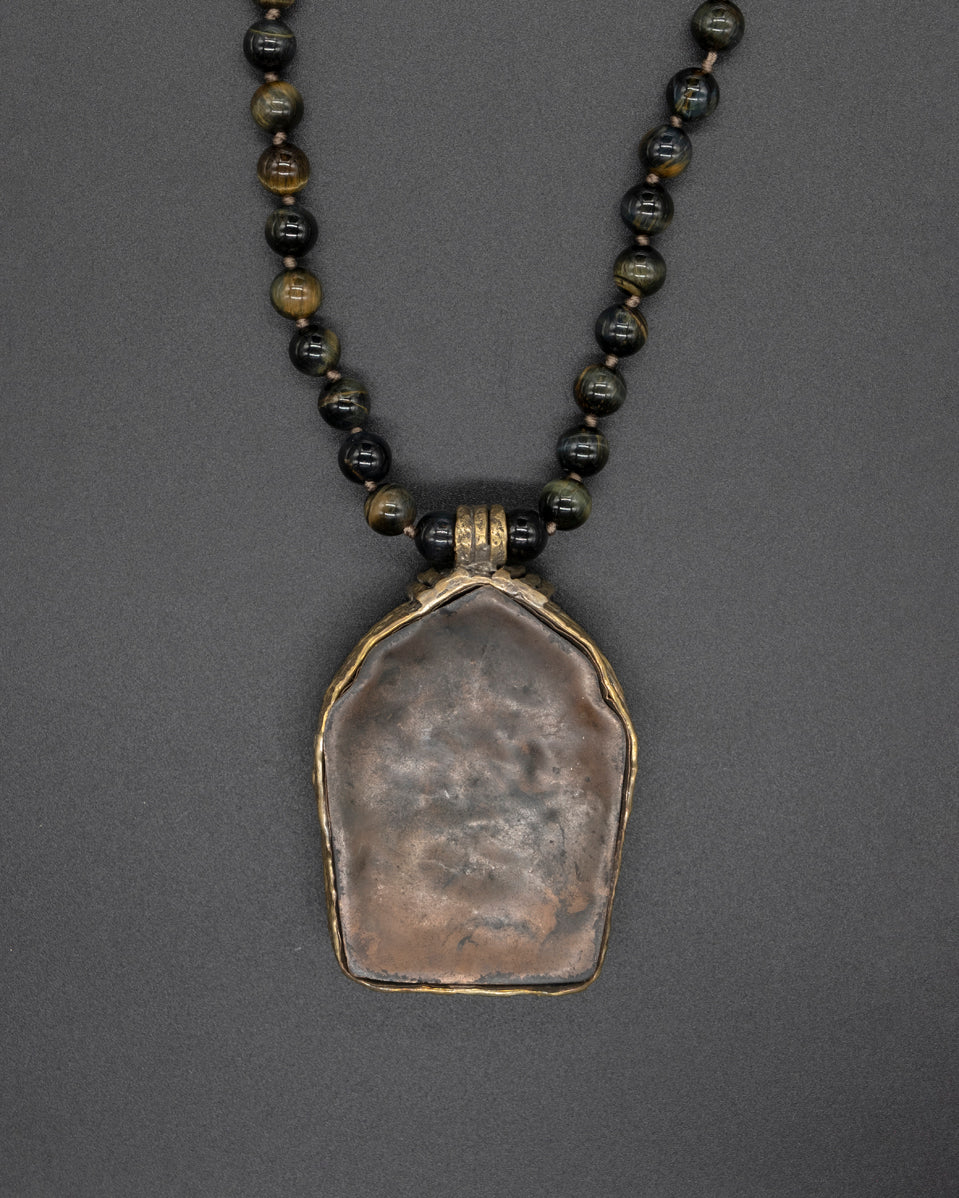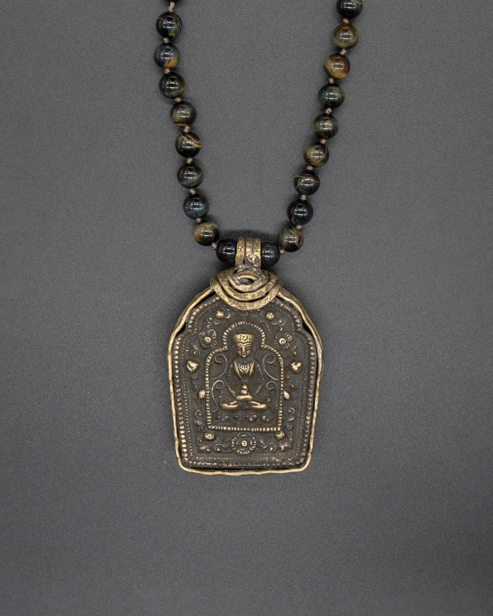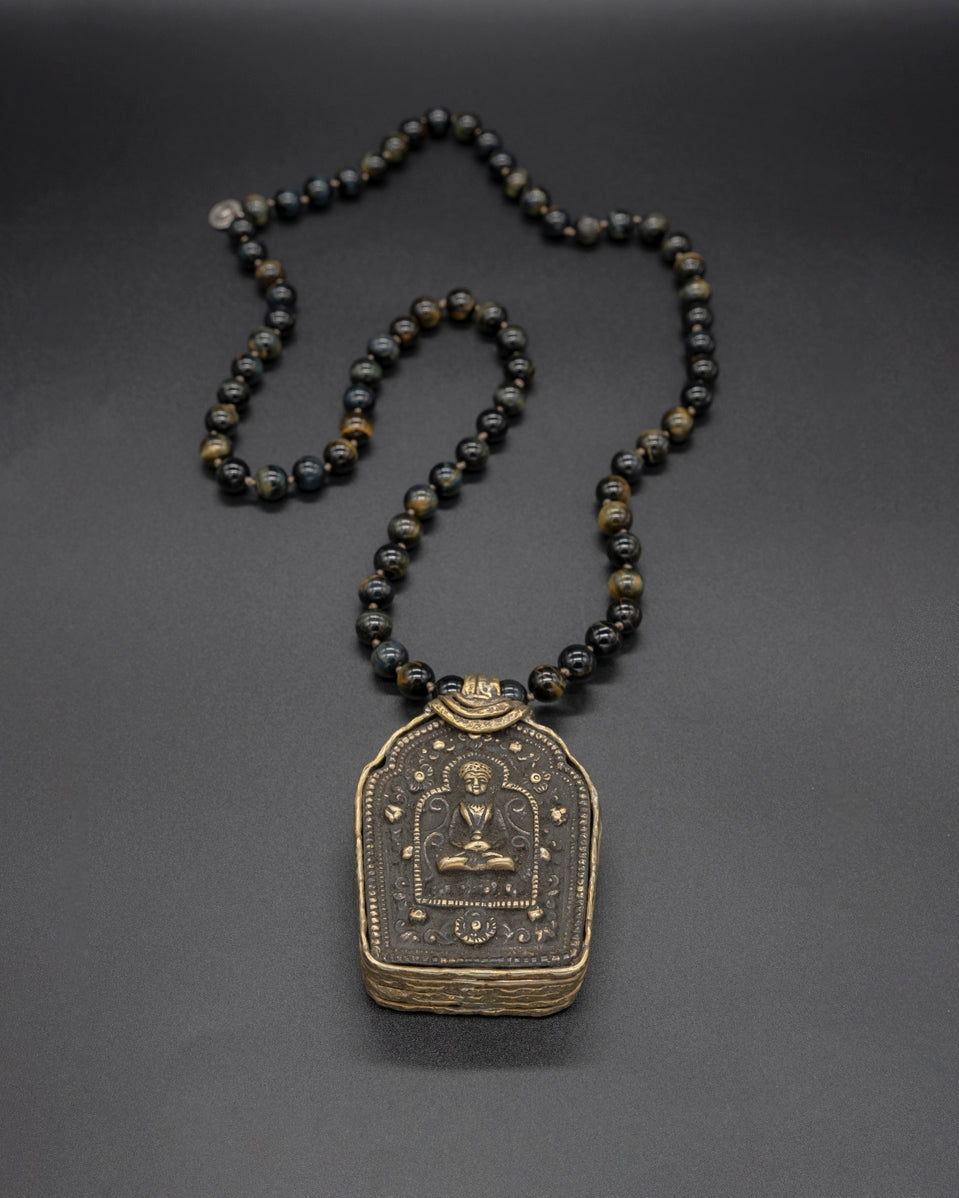 This unique vintage refurbished treasure can hold a sacred prayer within its beautifully crafted brass box. Suspended on a hand-knotted tiger eye chain, this pendant becomes a soulful companion, resonating tranquility and protection.