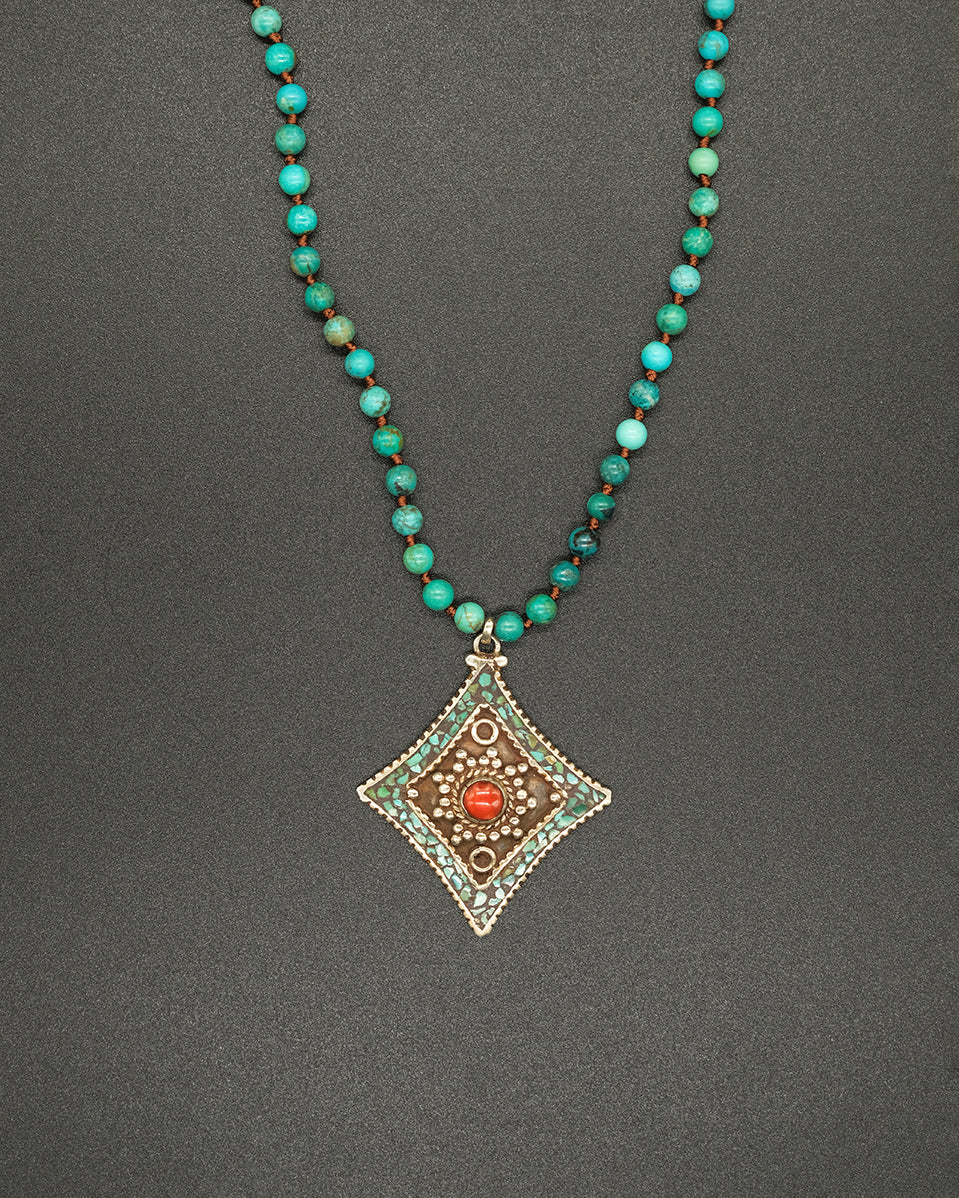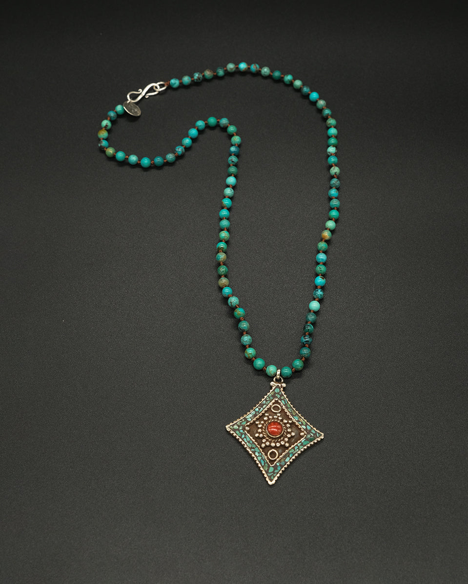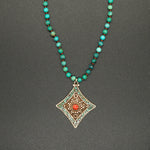 Preserve an ancient craft with this breathtaking vintage diamond shaped Tibetan pendant. From its unparalleled coral & turquoise detail and color to its matching turquoise chain, carefully hand knotted for lasting quality, this piece is truly incredible.