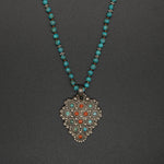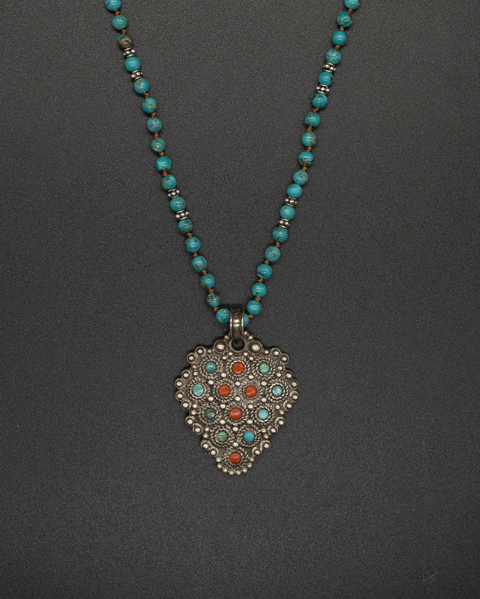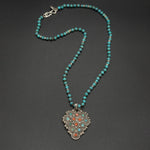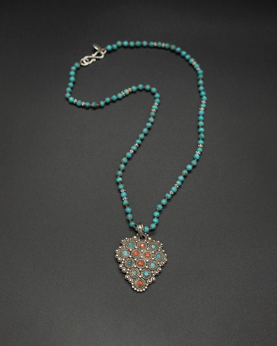 Bring a sense of tradition to your style with this vintage Tibetan pendant. Featuring turquoise and coral details, it is paired with a turquoise and silver chain that highlights its classic, artisanal character.