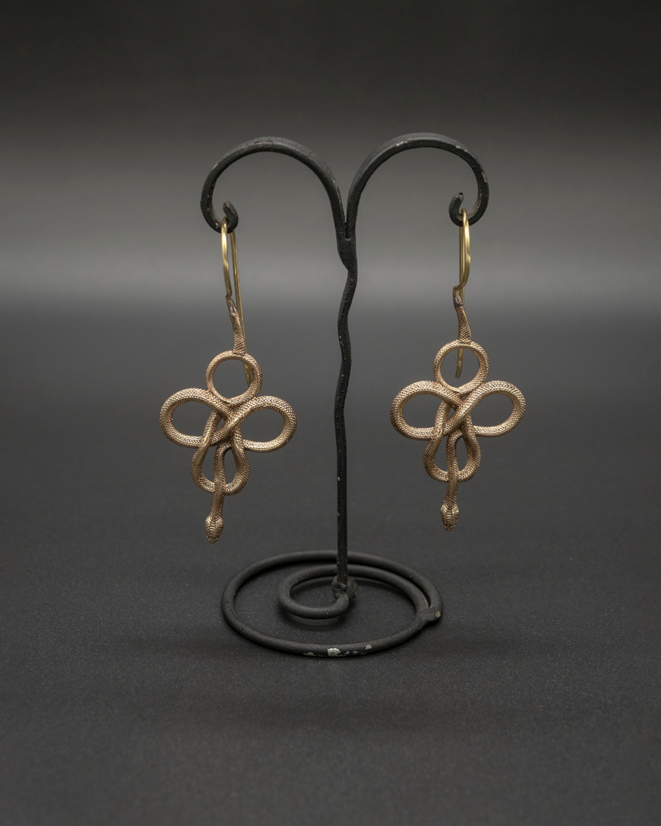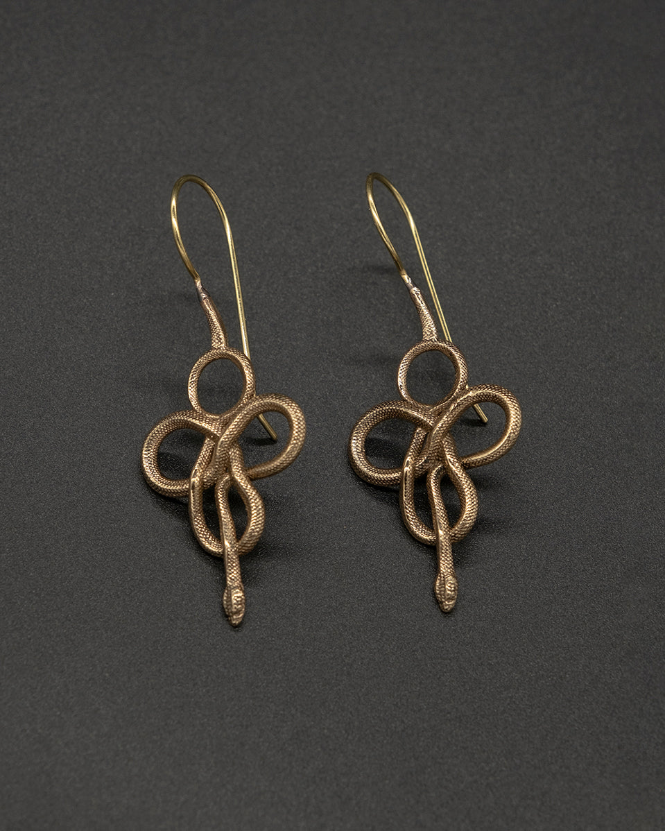 Sculptural bronze earrings with a twisted ular (snake-inspired) form, featuring an elongated silhouette that feels bold, fluid, and earthy.