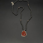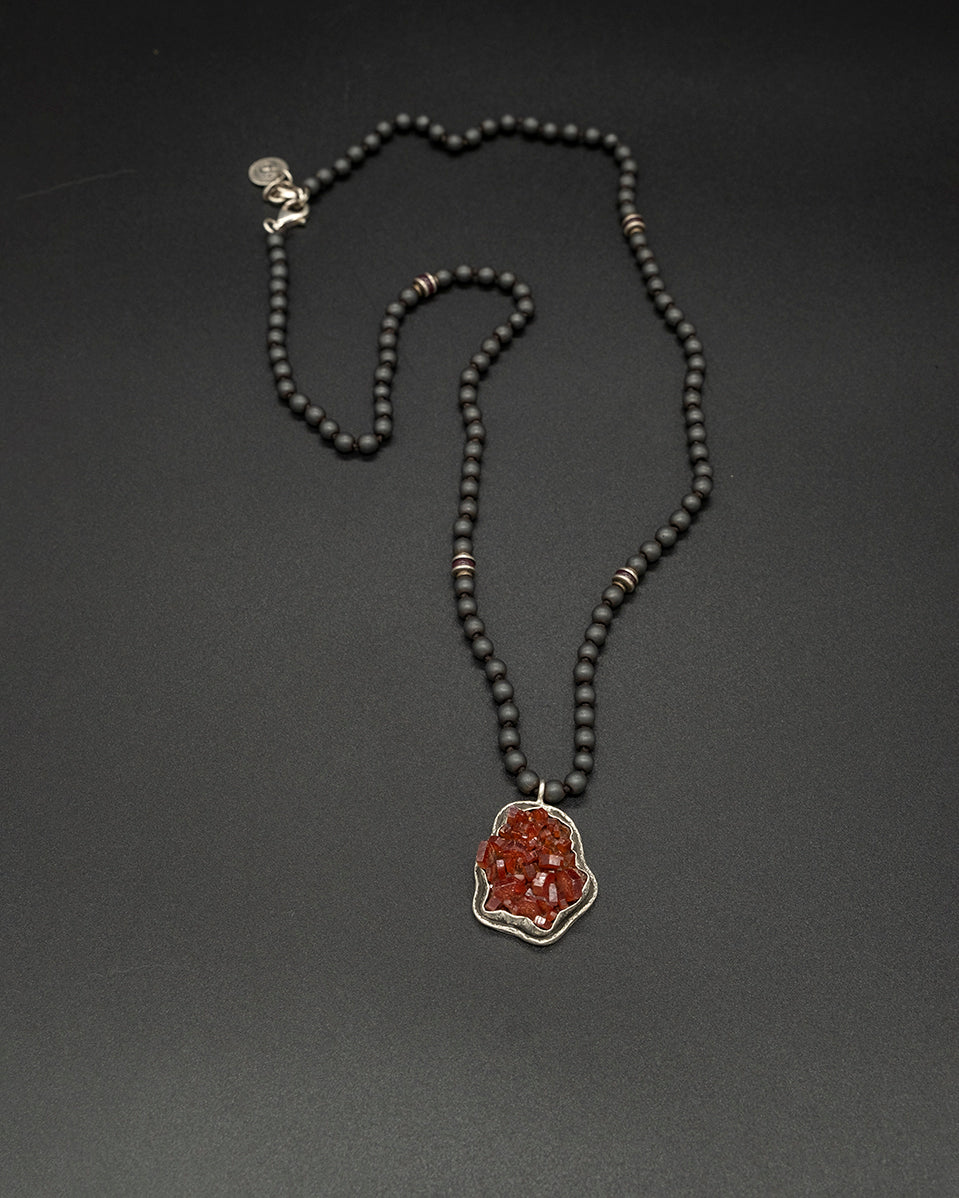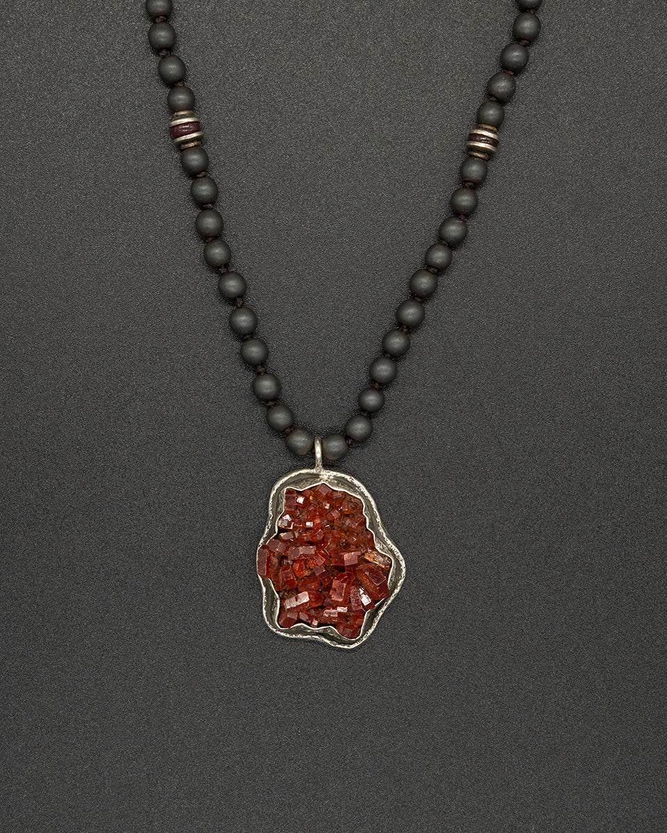This necklace features a striking vanadinite set in silver. Paired with a matte hematite and garnet silver chain, it offers rich contrast, depth, and a bold, mineral-inspired character.