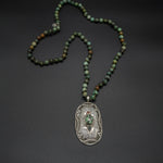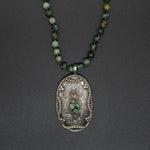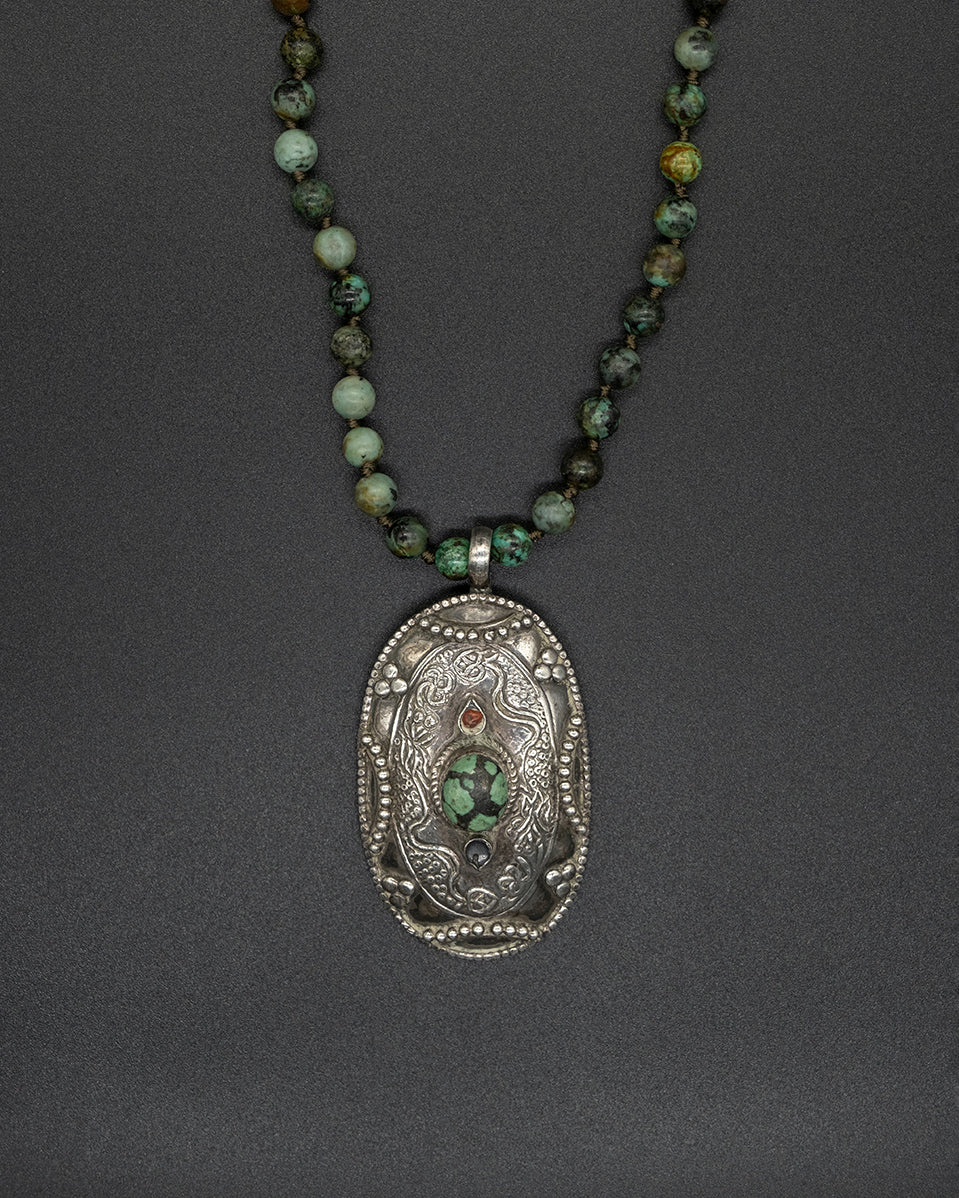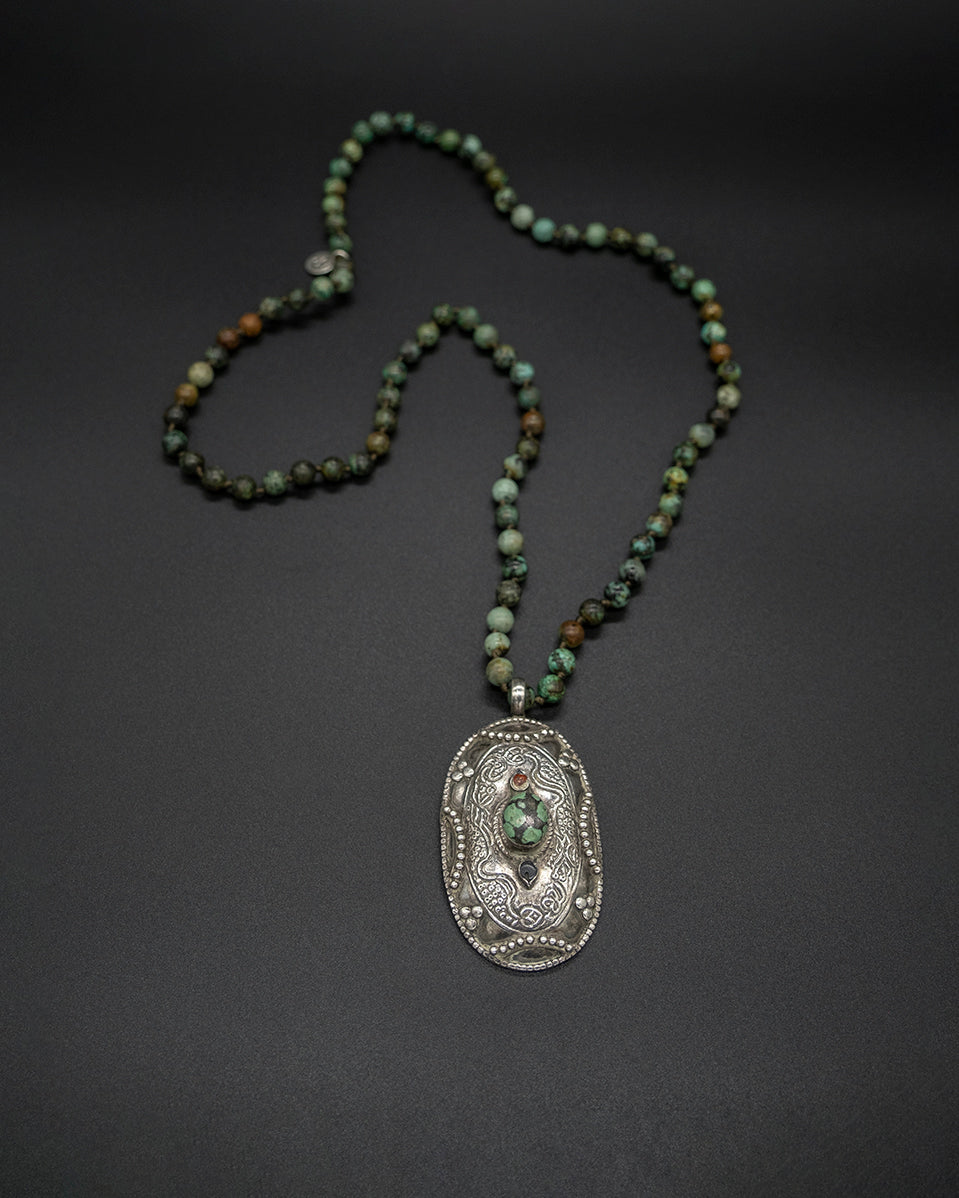 Crafted from silver, this vintage Tibetan pendant showcases a mesmerizing turquoise gemstone at its center, radiating green hues. Paired with a captivating African turquoise chain, this necklace thrives on the inherent beauty of the elements.