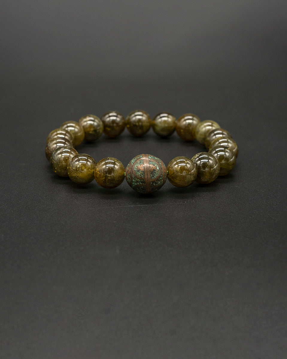 A vintage Tibetan brass turquoise bead paired with green garnet, creating an earthy, vibrant piece with timeless character and natural energy. Elastic for comfortable everyday wear