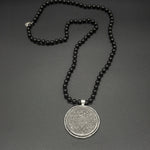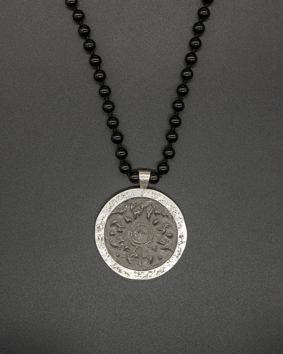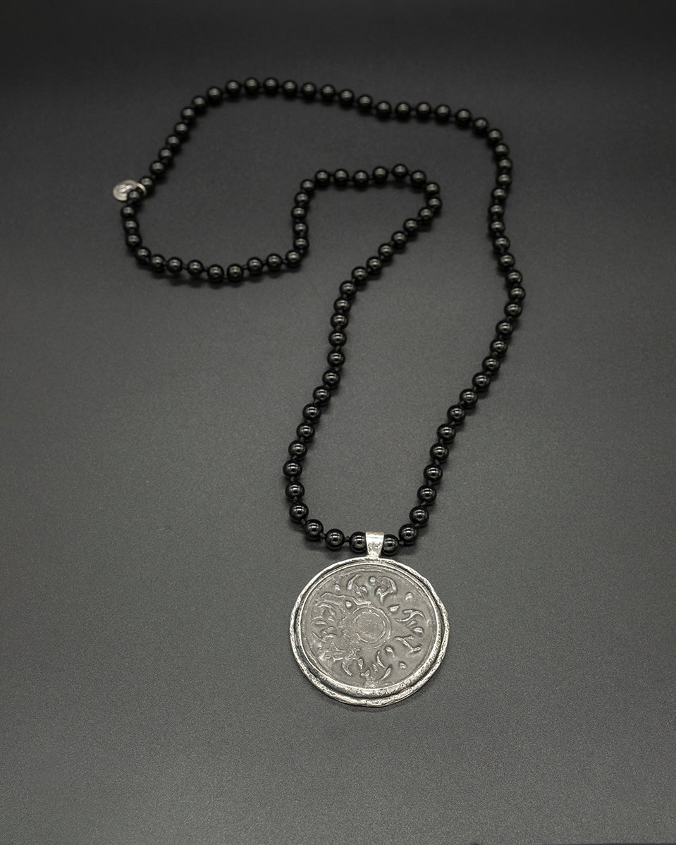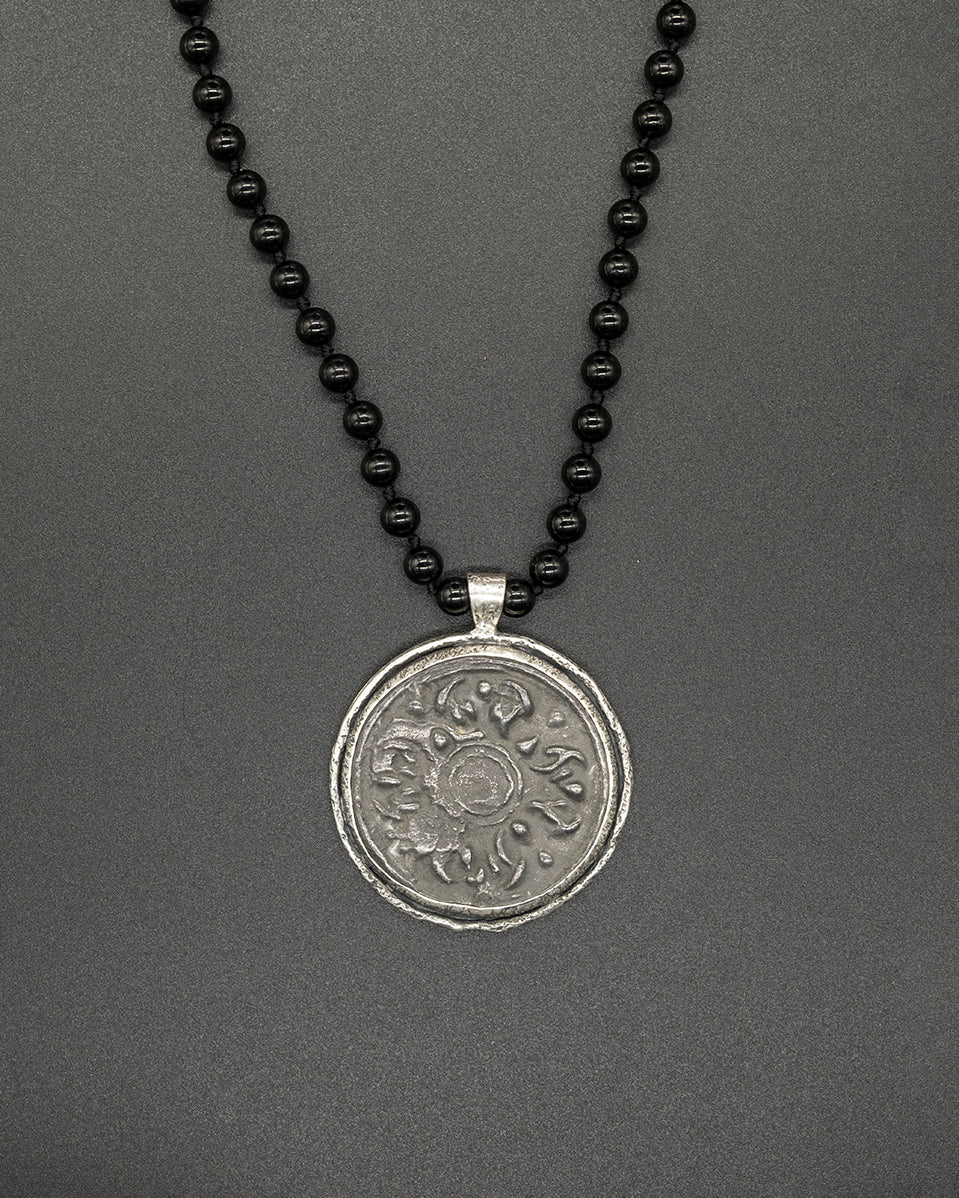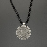 A vintage-inspired Tibetan coin pendant with a silver-textured finish, paired with a black tourmaline chain. Black tourmaline is known for its protective and grounding energy, making this timeless piece both symbolic and powerful—perfect for everyday wear with soulful character.