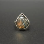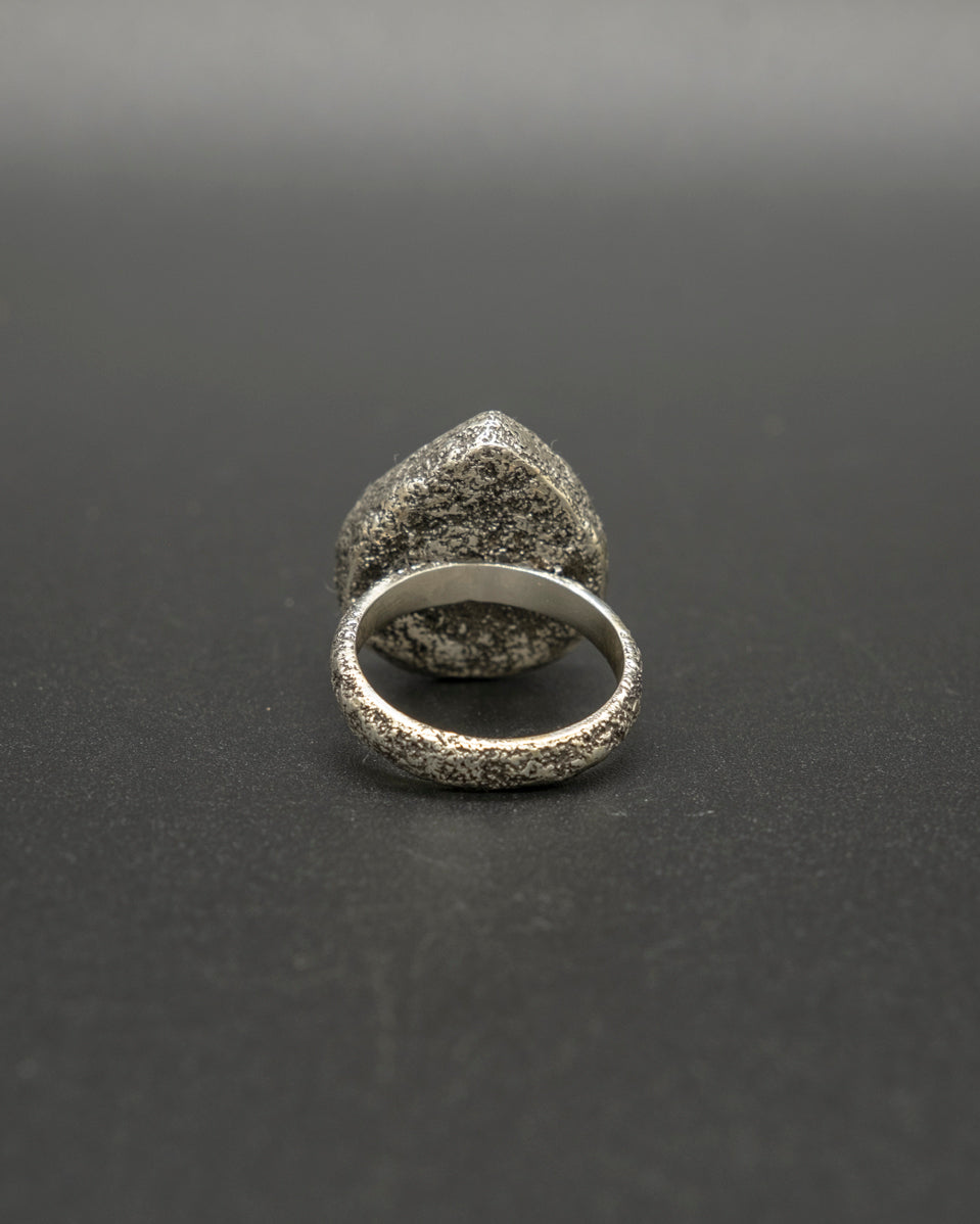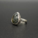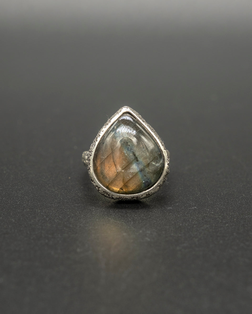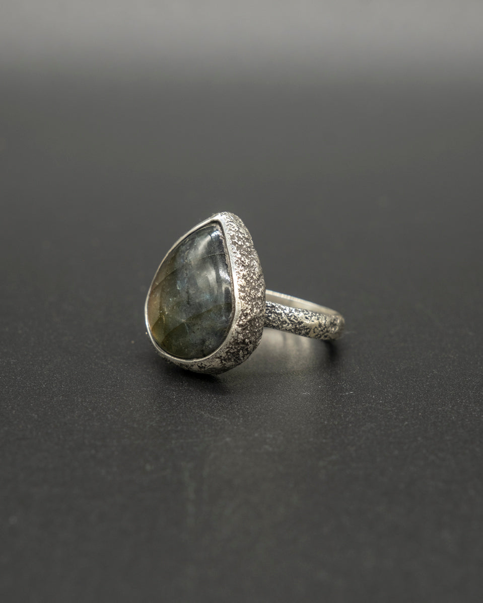 The Nordic Light ring encapsulates the mystery and beauty of the far North. With a labradorite stone that mirrors the radiant colors of the aurora borealis, it's a mesmerizing play of light and color. This turquoise, blue and green stone is set upon a hand dusted silver ring.