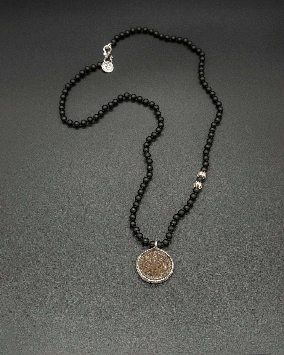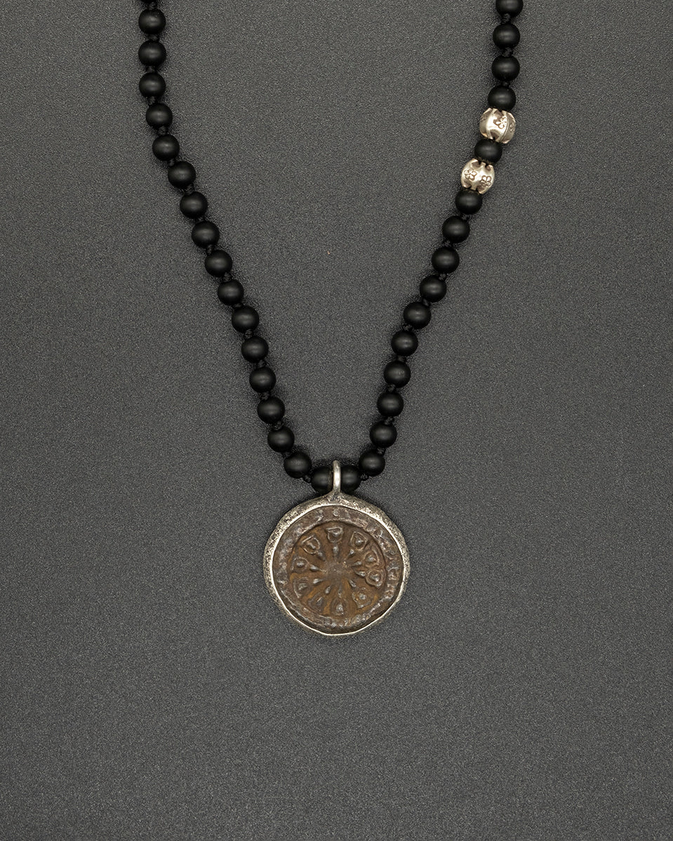This vintage metal karma wheel pendant is crafted with intricate detail and framed in textured sterling silver. This exquisite piece represents the eternal circle of life and death, allowing you to connect with your spiritual side. The onyx stone chain and silver accents add a touch of contrast. The karma wheel is a constant reminder to stay true to your path and embrace the journey.
