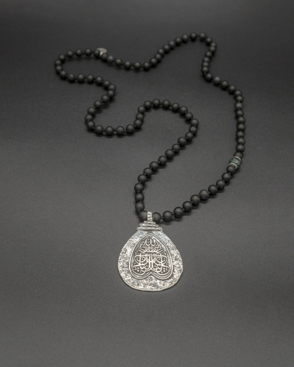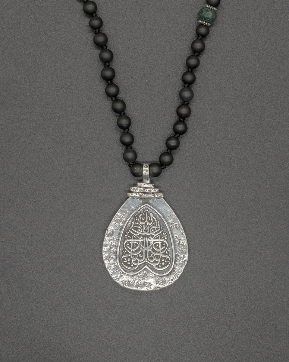 Experience the perfect blend of beauty and spirituality with our exquisite Sufi Heart necklace. Hand-knotted using the finest onyx beads, accented with emerald, this remarkable piece showcases the timeless art of Arabic calligraphy. Each delicate detail is meticulously crafted to compliment the captivating silver centerpiece.