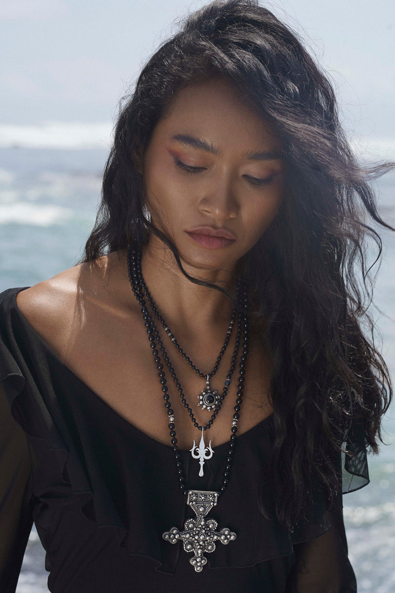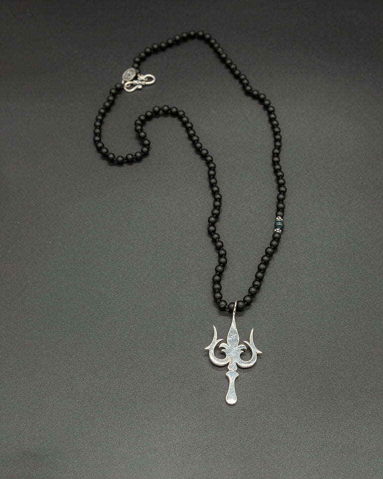 The Trishula, our exquisite silver Shiva pendant, is expertly crafted on an onyx chain and adorned with silver and kyanite. This ancient symbol represents the three stages of consciousness, serving as a reminder of the cyclical nature of life and the importance of finding harmony within oneself.