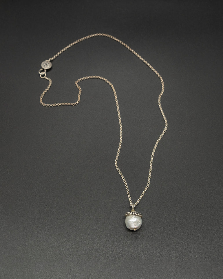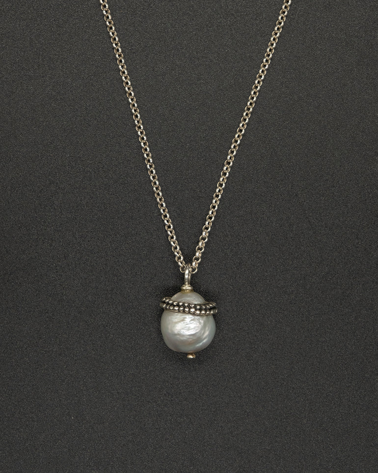 This beautiful South Sea pearl is perfectly imperfect. Its unique shape and size make it an eye-catching and exquisite accent piece. It is embraced with a silver studded belt and hangs on a delicate silver chain.