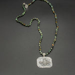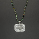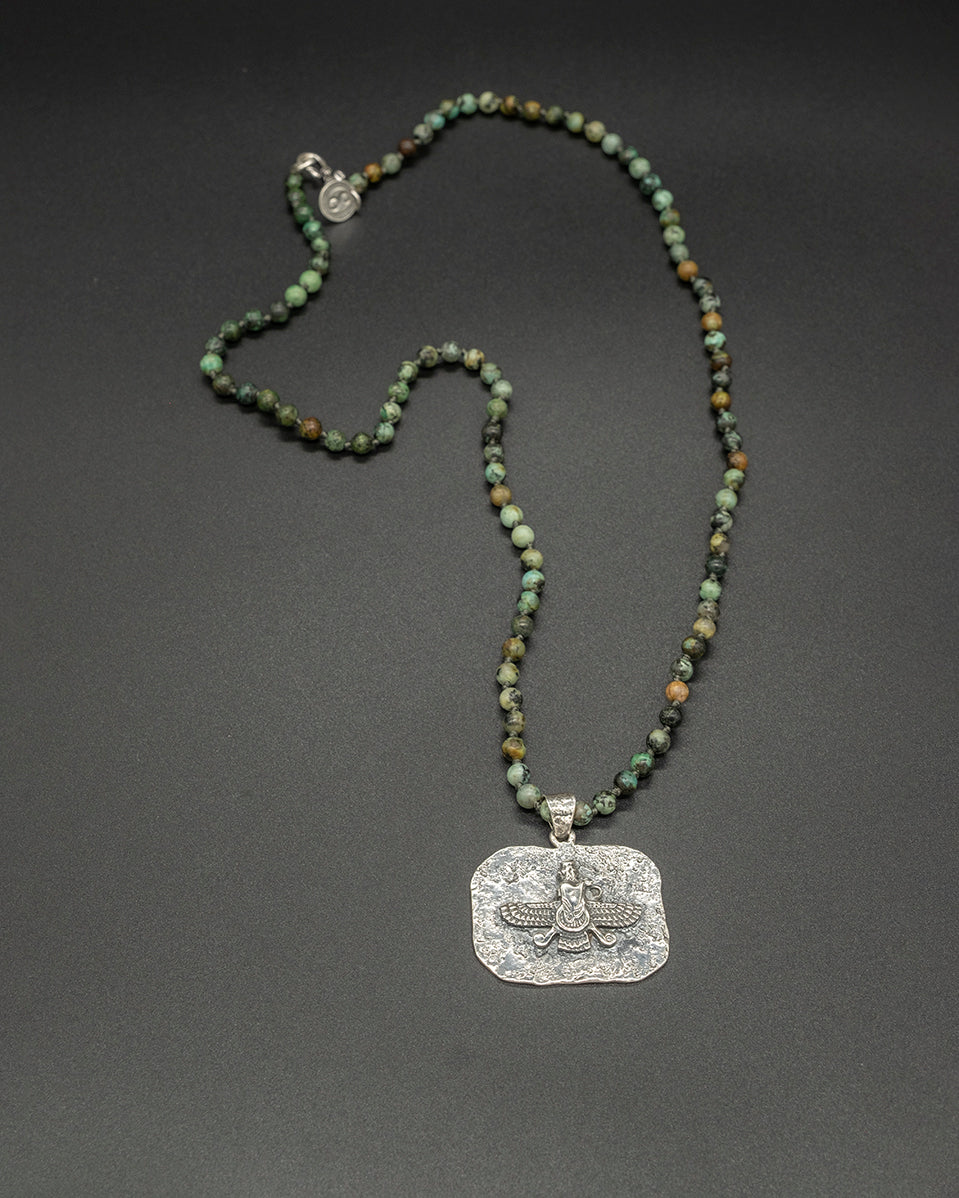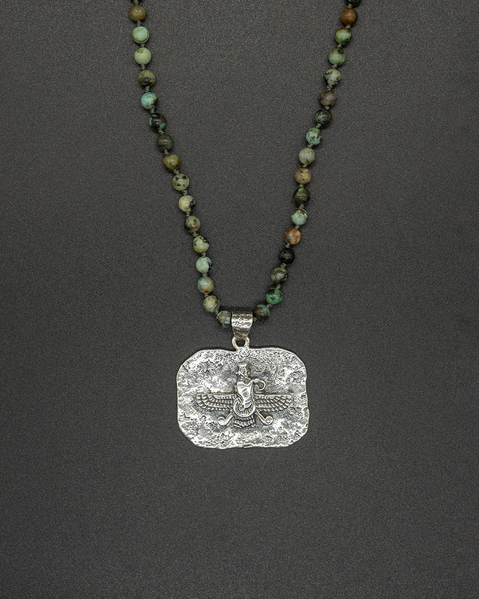 A silver Farvahar pendant paired with an African turquoise chain. In Iranian tradition, the Farvahar symbolizes the soul and the path of good thoughts, good words, and good deeds, representing wisdom and spiritual progress. A meaningful piece with earthy, timeless character.