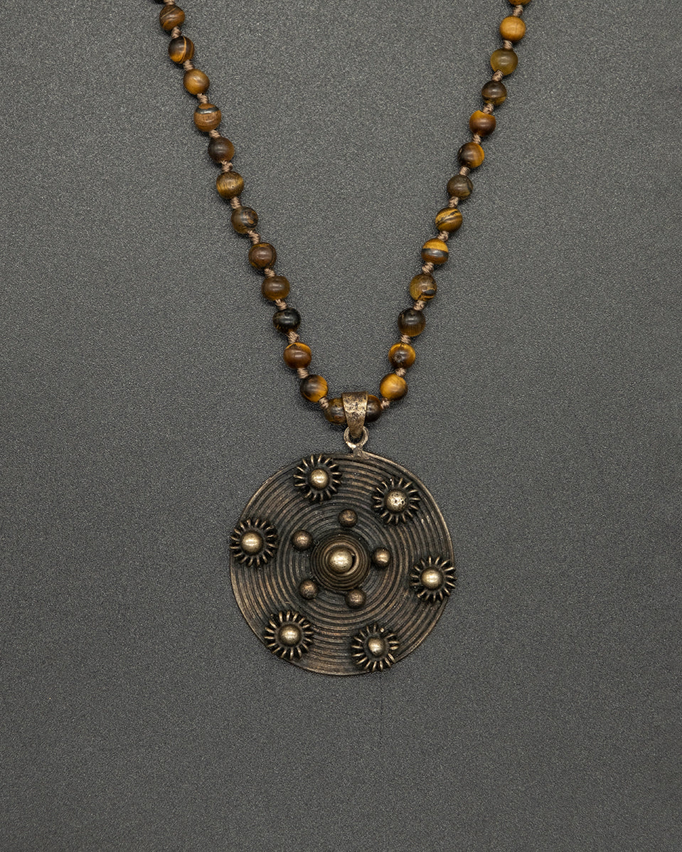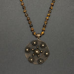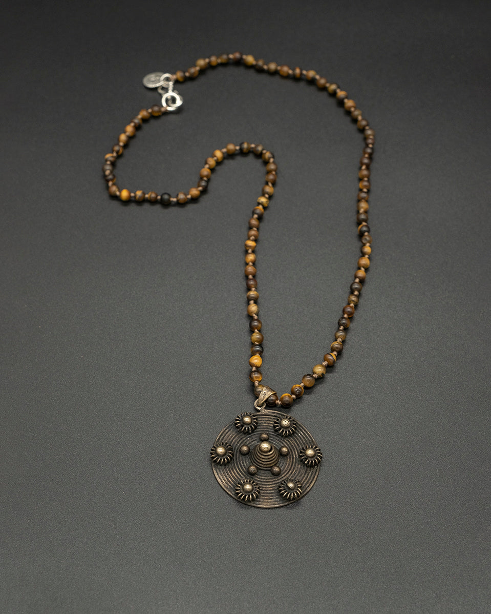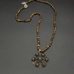 A warm, earthy piece featuring a vintage brass pendant paired with a shimmering tigereye chain. The golden tones of the brass blend naturally with the stone’s rich chatoyance, creating a timeless necklace with grounding energy and vintage charm.