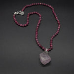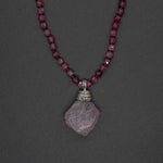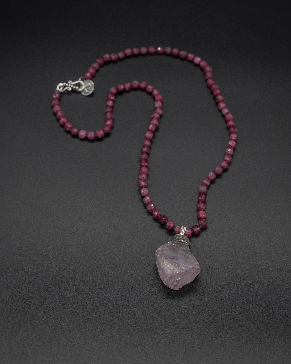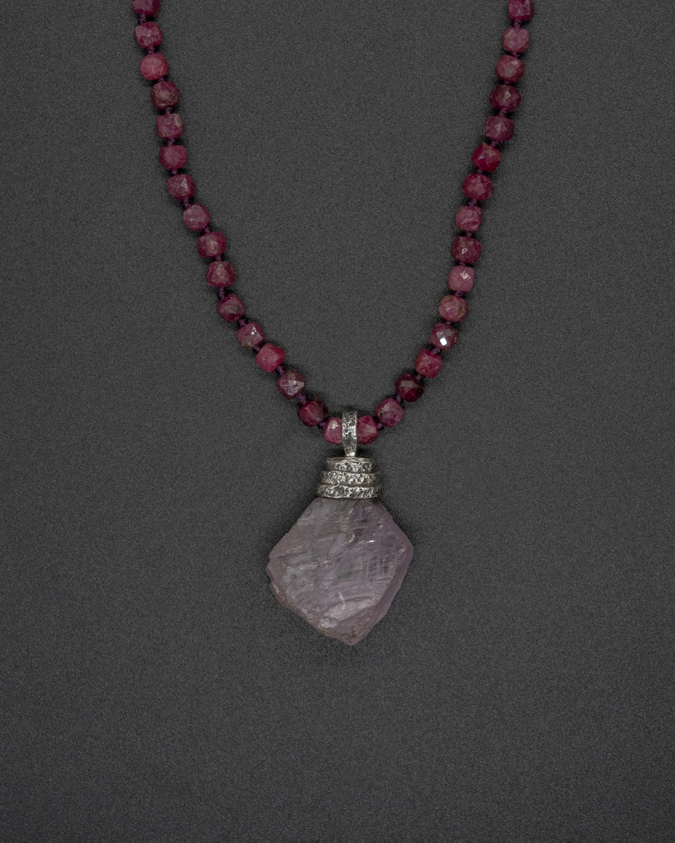 Our raw-cut Afghanistan kunzite gem, tastefully capped in silver, radiates a soft and delicate aura. Paired with a hand-knotted Burma ruby chain, this piece seamlessly marries Ruby, the stone of love, and Kunzite, the stone of healing.