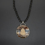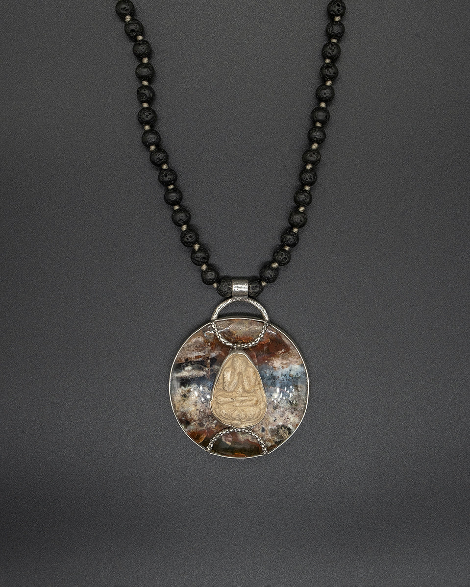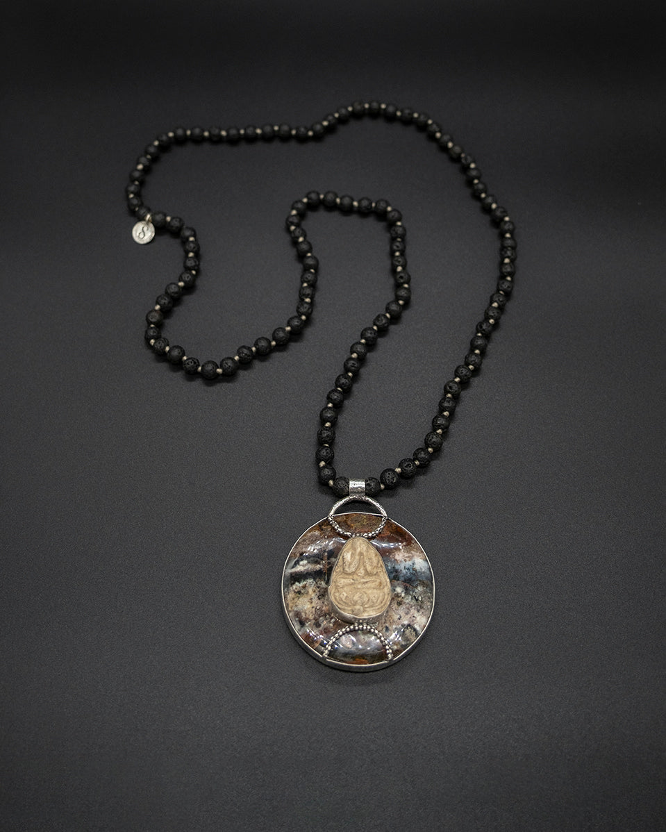 A soulful piece featuring a serene closed-eye Buddha carved in natural agate, set within a vintage silver frame. Paired with a textured lava stone chain, this necklace blends grounding energy with calm spiritual presence, creating a unique and meaningful statement piece.