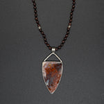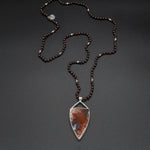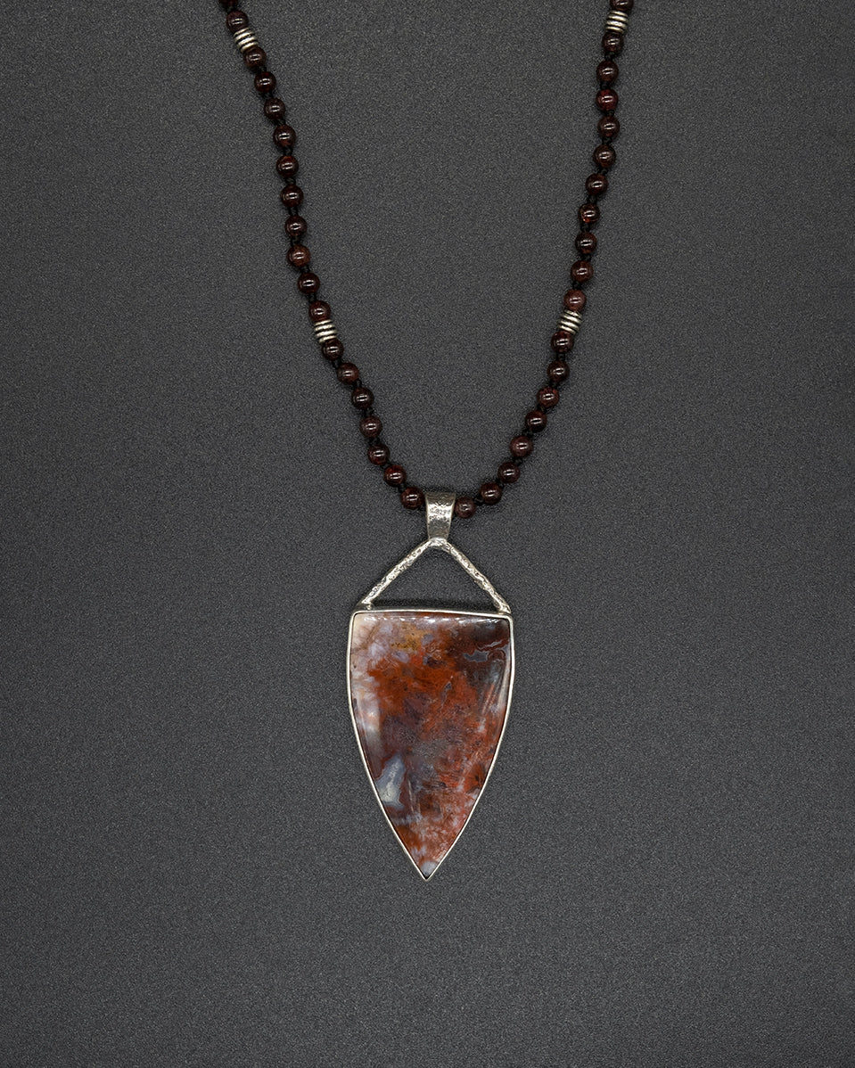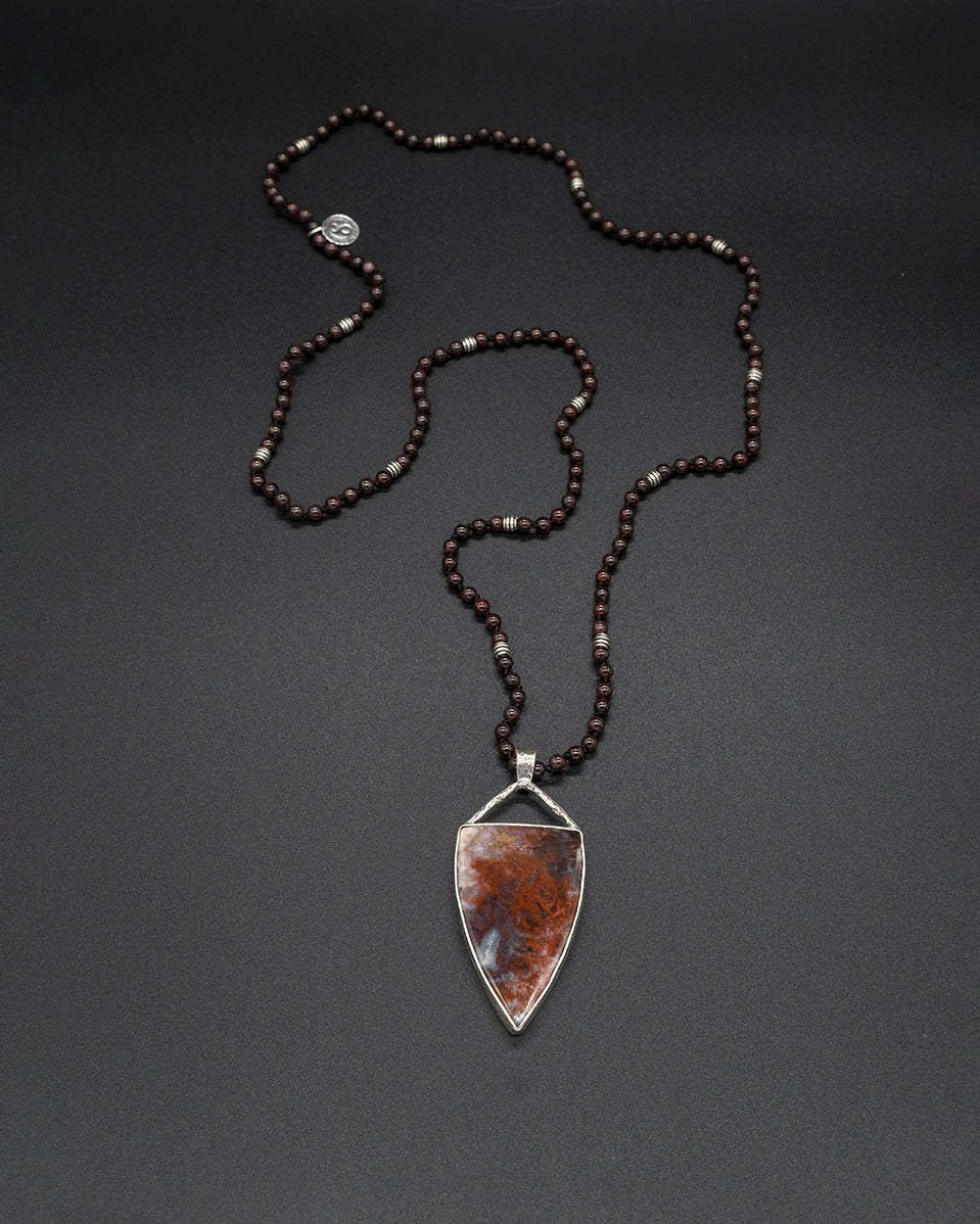 A refined piece featuring a rich red agate set in an elegant silver frame, paired with a garnet-beaded silver chain. The warm tones of agate and garnet complement each other beautifully, creating a timeless necklace with natural depth and vibrant charm.