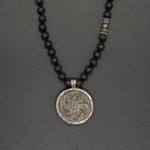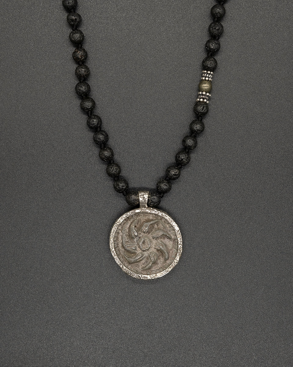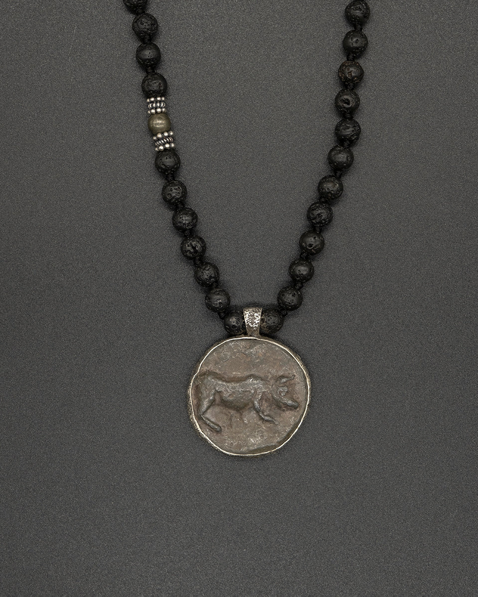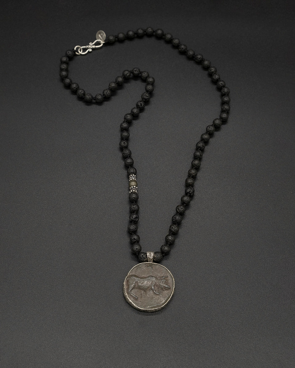 This vintage Chinese cow zodiac sign metal pendant is a marriage of mystical Chinese symbolism with a modern twist. The charismatic cow pendant, representing the Chinese zodiac sign of the cow, captures diligence, honesty, and strength. The pendant is paired with a sturdy lava stone chain, accented with silver & pyrite, hand-knotted for that exclusive touch.