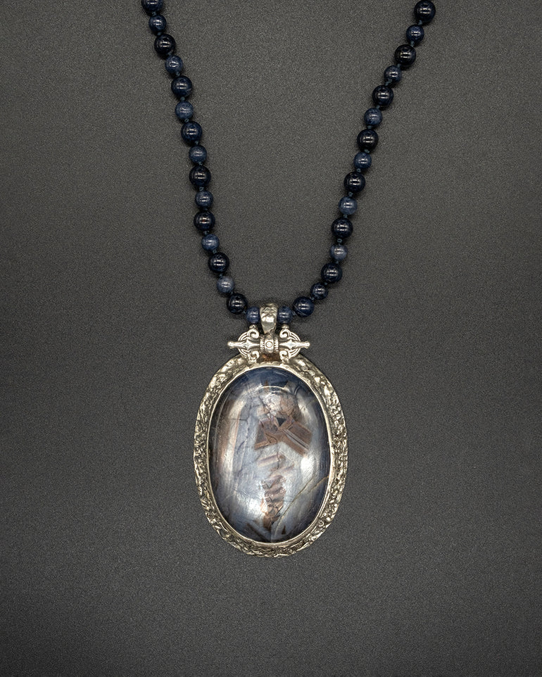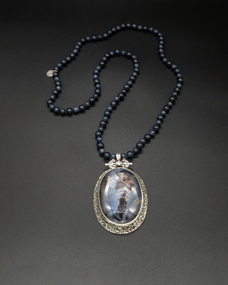 Adorn yourself with a piece of ancient Tibetan tradition with our exquisite sapphire and Vajra necklace. Expertly crafted from sterling silver and featuring an enchanting sapphire center stone, framed in texted silver and crowned with a silver vajra. Perfected paired with a matching hand-knotted sapphire chain.