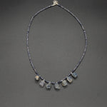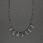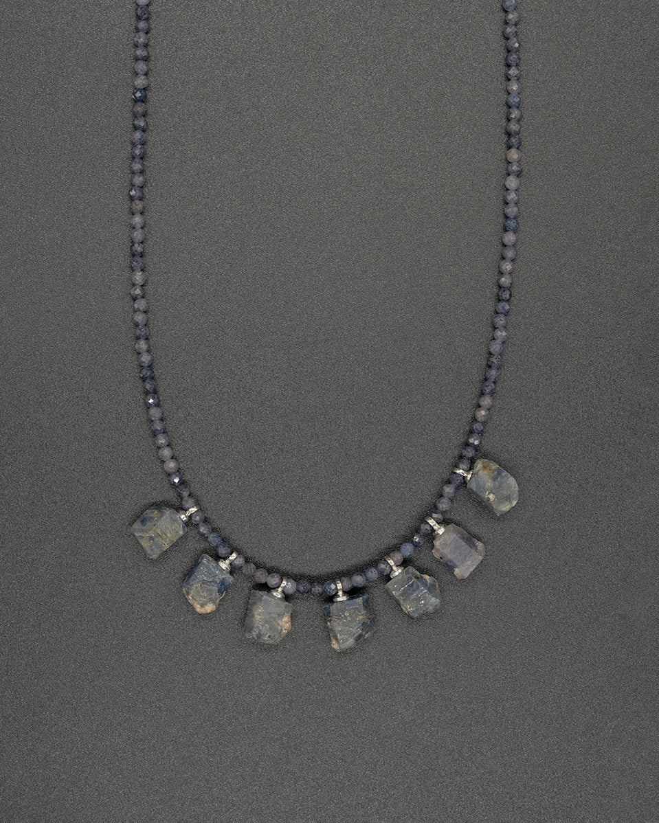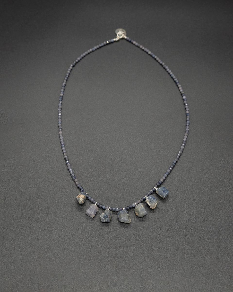 Our raw Burma sapphire hand-knotted necklace features a mesmerizing row of sapphire drops. This necklace showcases the natural beauty of raw moonstone, renowned for its properties believed to shield one from danger and to mediate conflicts.