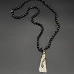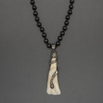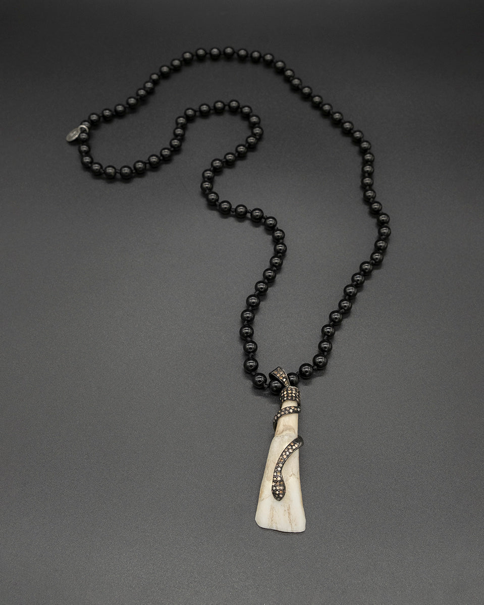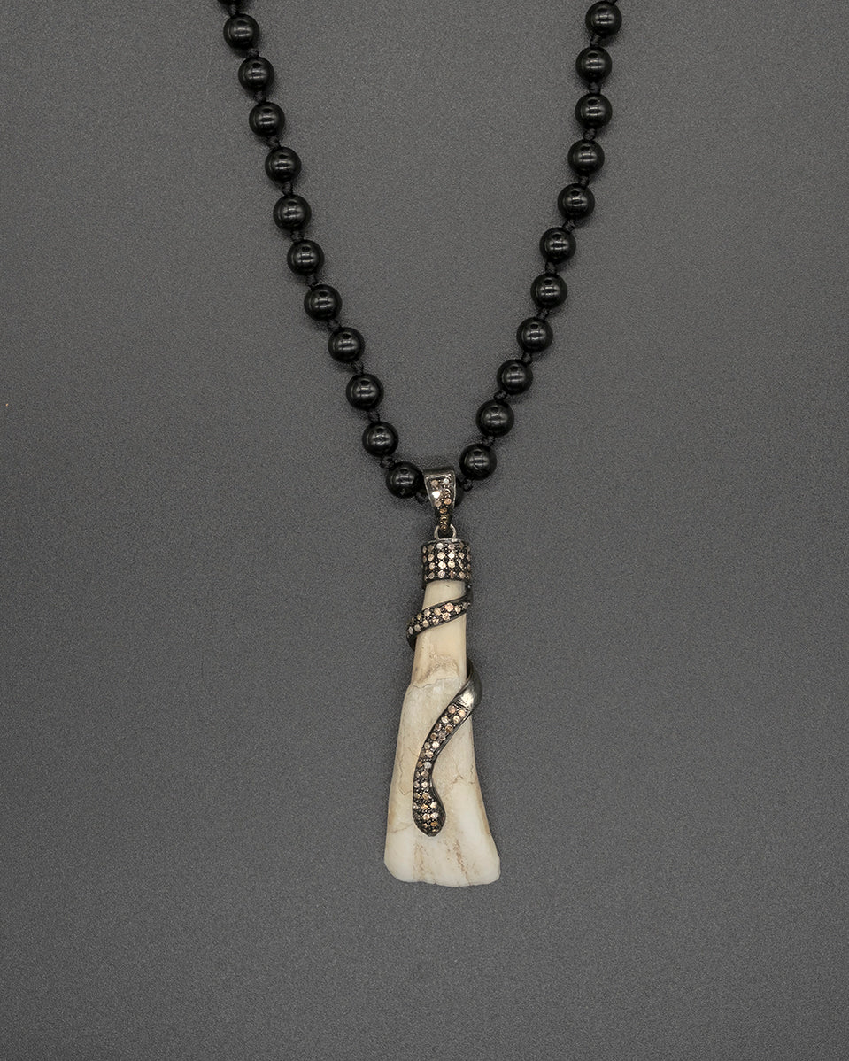 This enchanting snake tooth pendant is beautifully detailed, featuring a coiling diamond snake on carved bone! And the contrasting hand-knotted black tourmaline chain looks stunning when paired together.