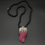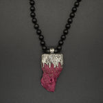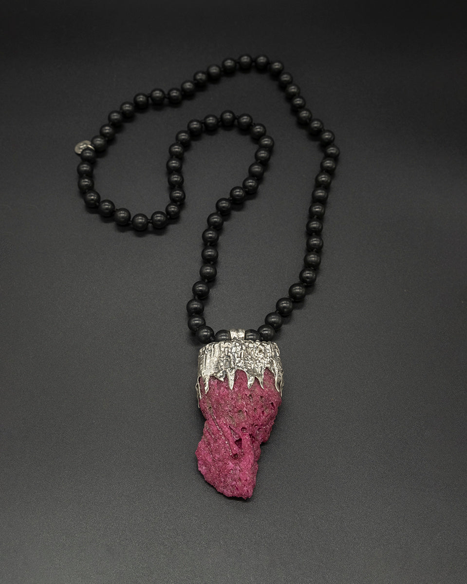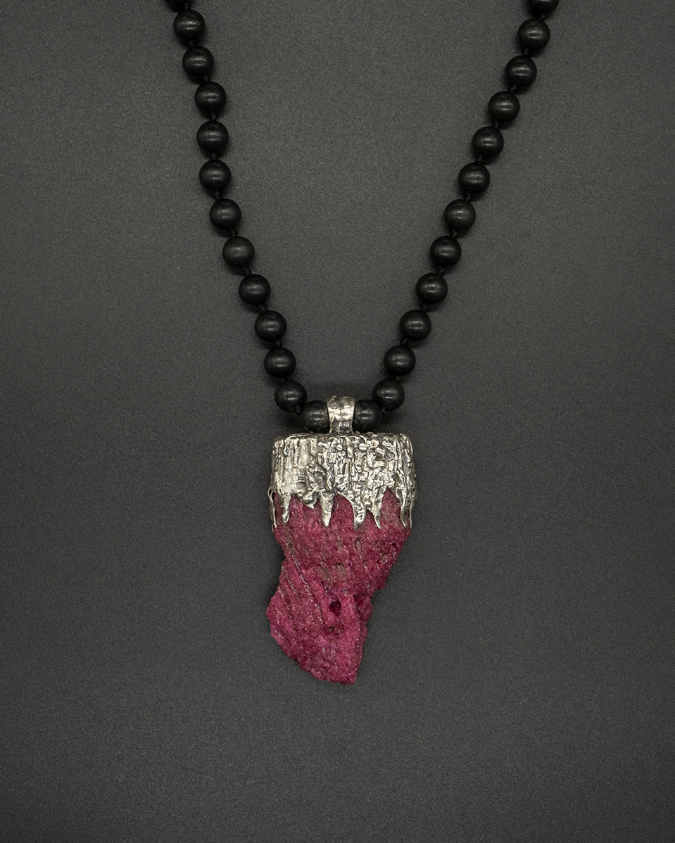 At its heart lies a raw cut African ruby, celebrated for its deep, rich hue and captivating allure, which is elegantly capped in hand-textured silver. This striking ruby is not just a beautiful adornment; it embodies the essence of wealth, good fortune, wisdom, and love, echoing the traditions of medieval Europe where rubies were cherished as tokens of prosperity. Complementing this centerpiece is a shungite chain, known for its grounding properties and unique black sheen, creating a perfect contrast that enhances the ruby's vibrant pink tones.