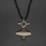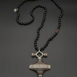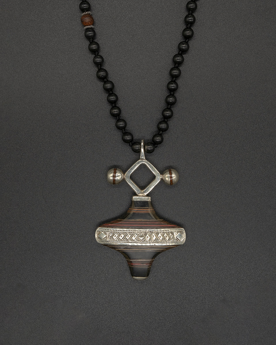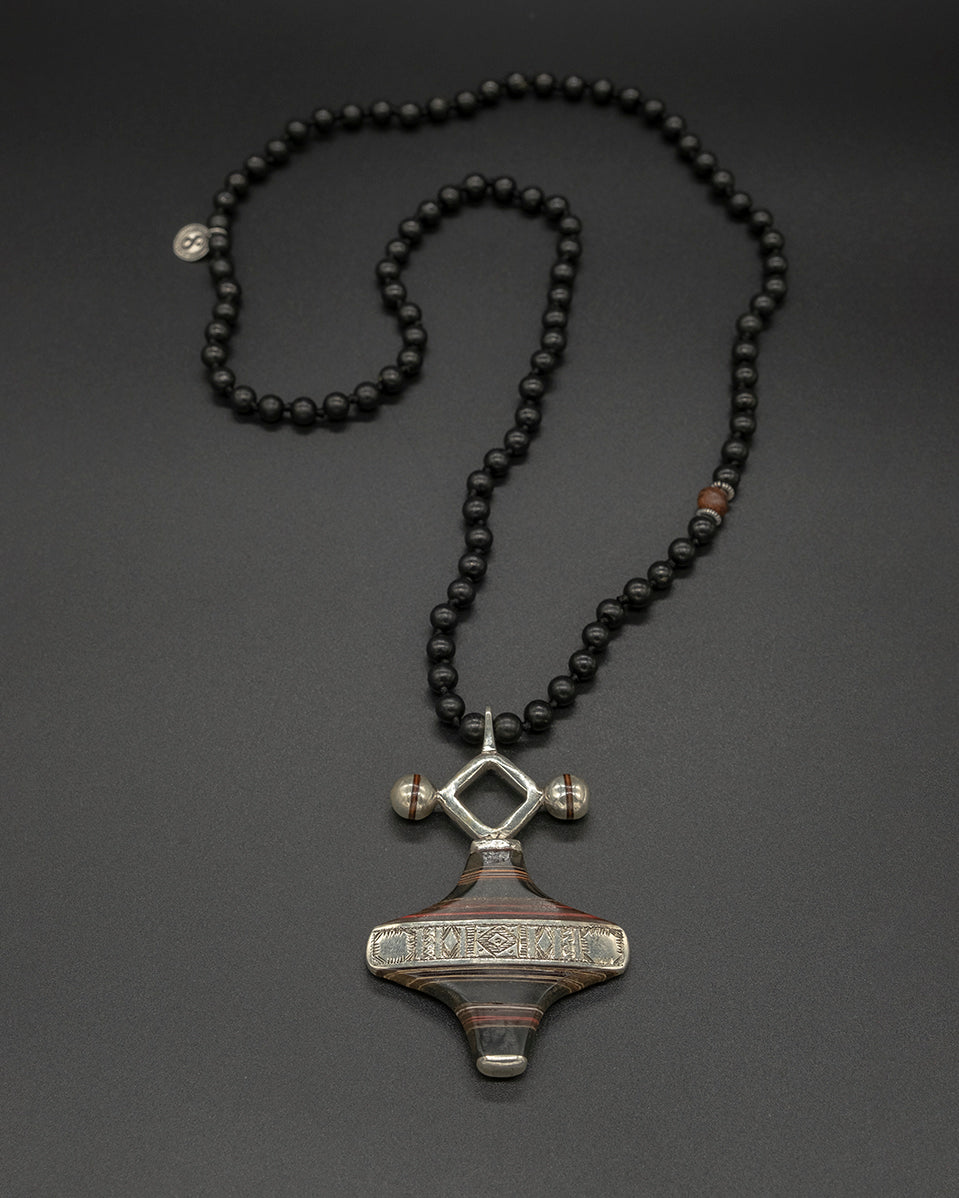 This unique pendant captures the essence of the traditional Tuareg design. Nomads of the desert, the Tuareg inhabit a vast territory spanning from the Moroccan Saharan desert to Burkina Faso in the south. This silver and wood Tuareg Cross is paired with a hand-knotted shungite chain, accented with silver and moringa.