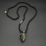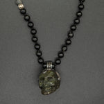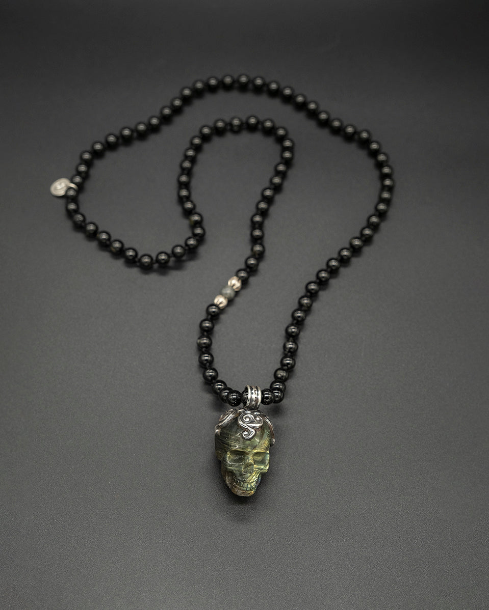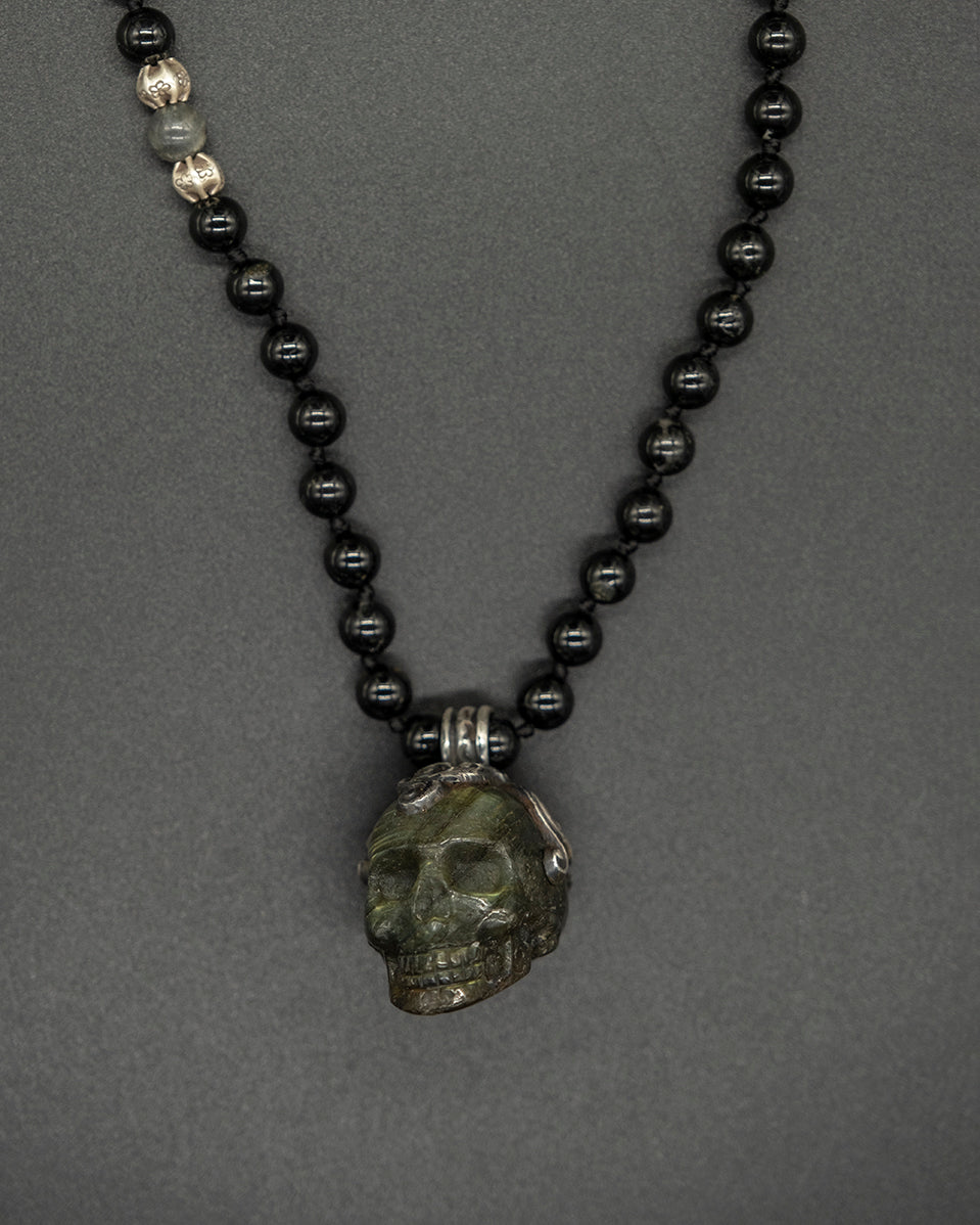 This unique piece featuring a meticulously carved labradorite Kapala skull pendant is crowned in silver, exuding an air of sophistication and mystery. The pendant hangs from a robust black tourmaline chain, accented with shimmering silver and a captivating labradorite stone, creating a harmonious blend of elegance and edge.