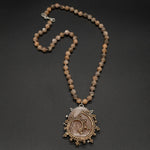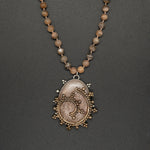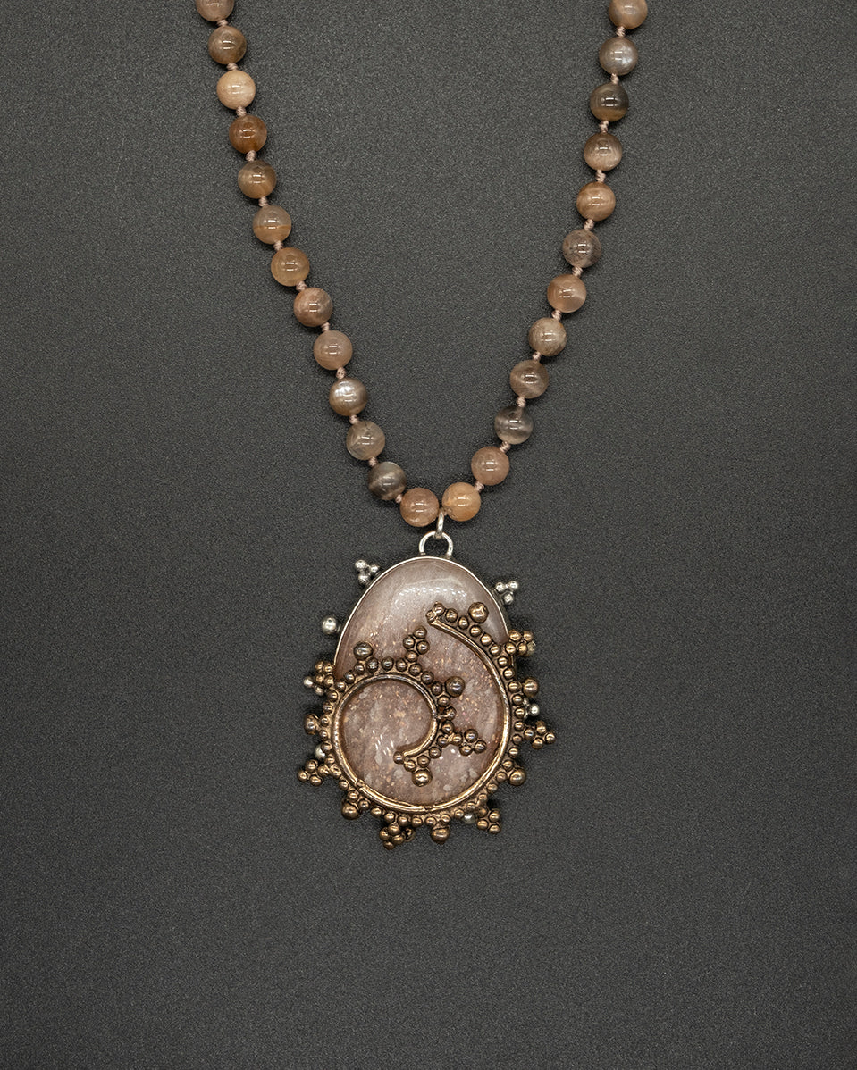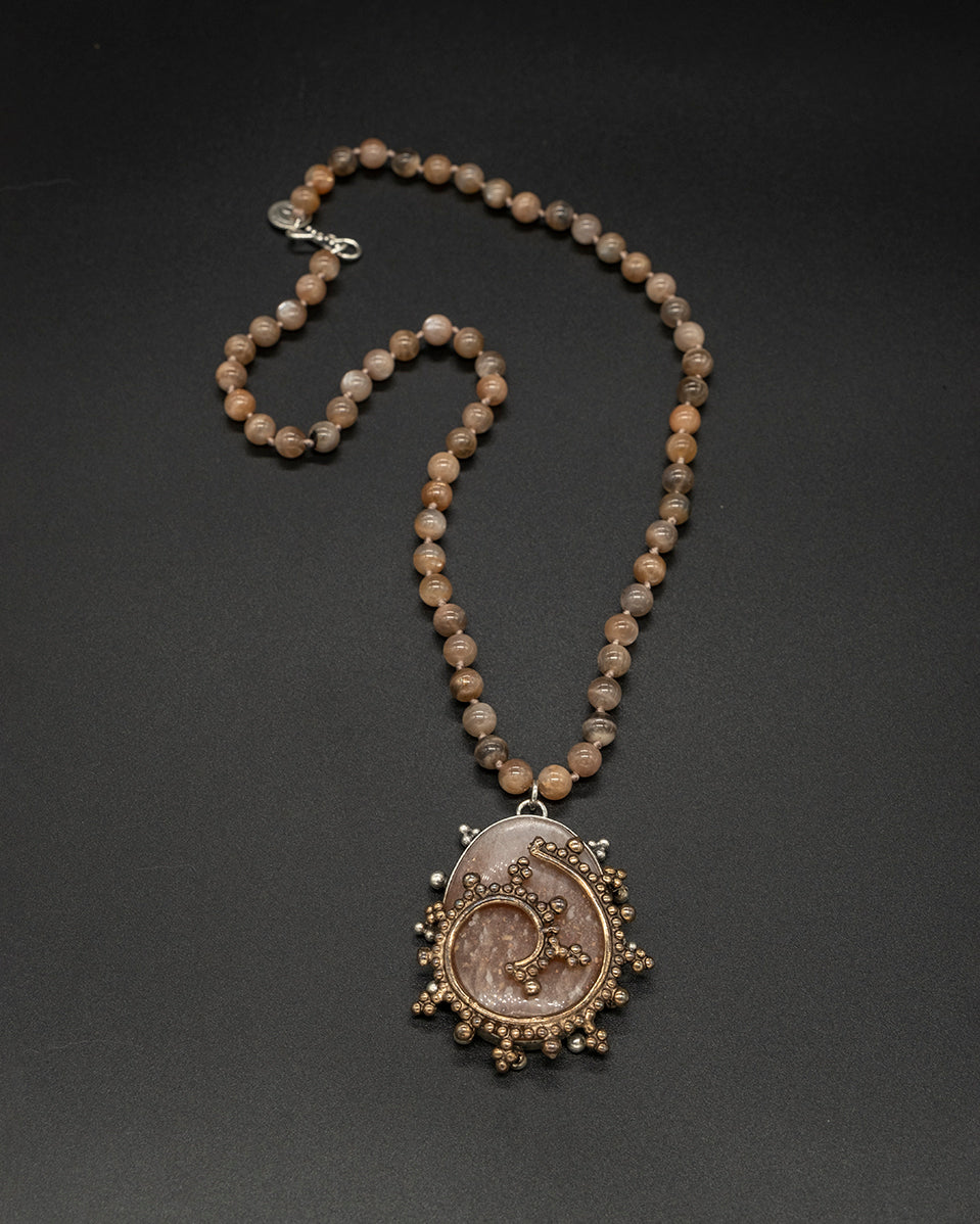 This sunstone pendant is full of striking hues. The unique brass spiral shape is flawlessly shaped over the silver framed sunstone, paired with a hand knotted mixed moonstone chain.