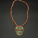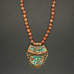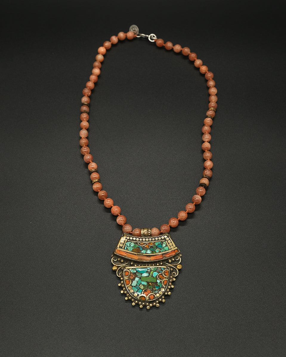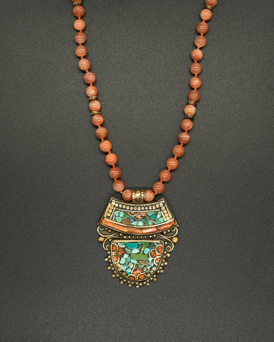 Embrace the beauty and heritage of Nepal with this exquisite necklace featuring a vintage Nepalese brass pendant, on a delicate hand-knotted sunstone & brass accented chain.