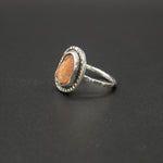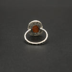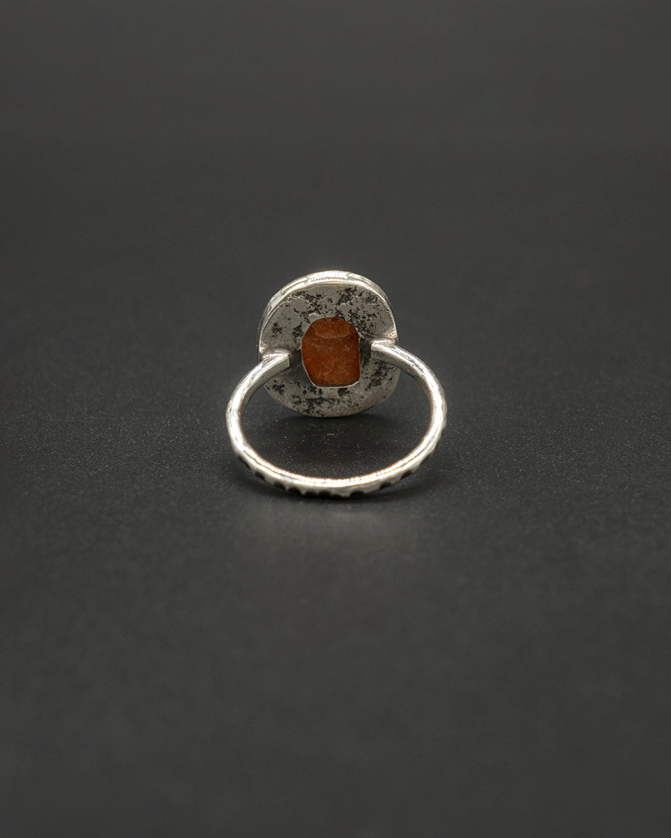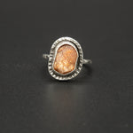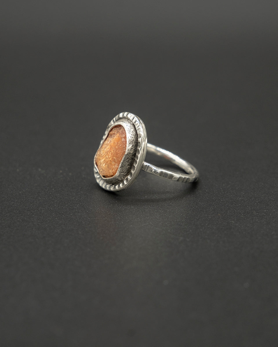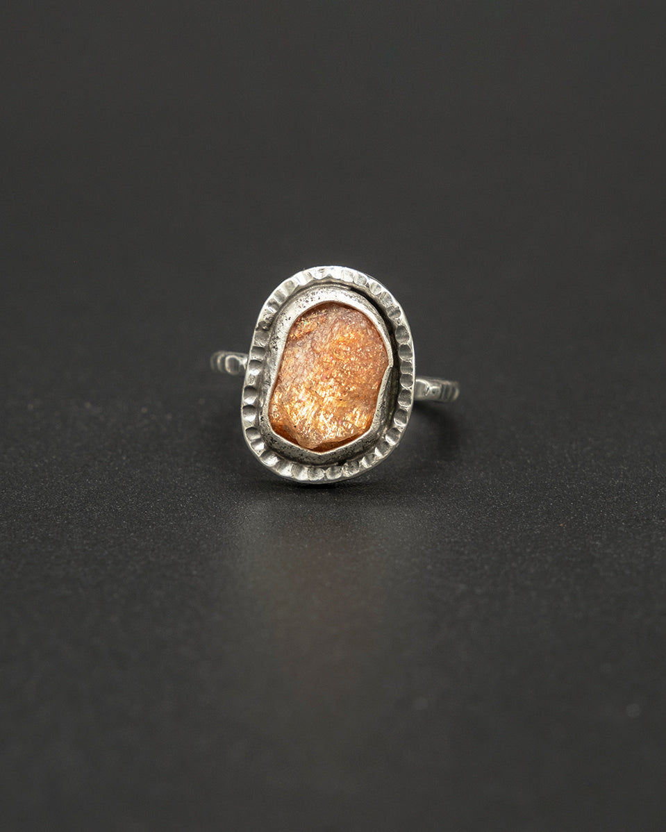A warm sunstone set in hand-textured silver, glowing with soft golden sparks that shift with the light. The organic silver finish highlights the stone’s natural radiance, creating a piece that feels bright, uplifting, and full of quiet energy. A gentle touch of sunshine for the soul.