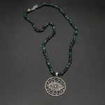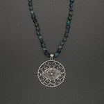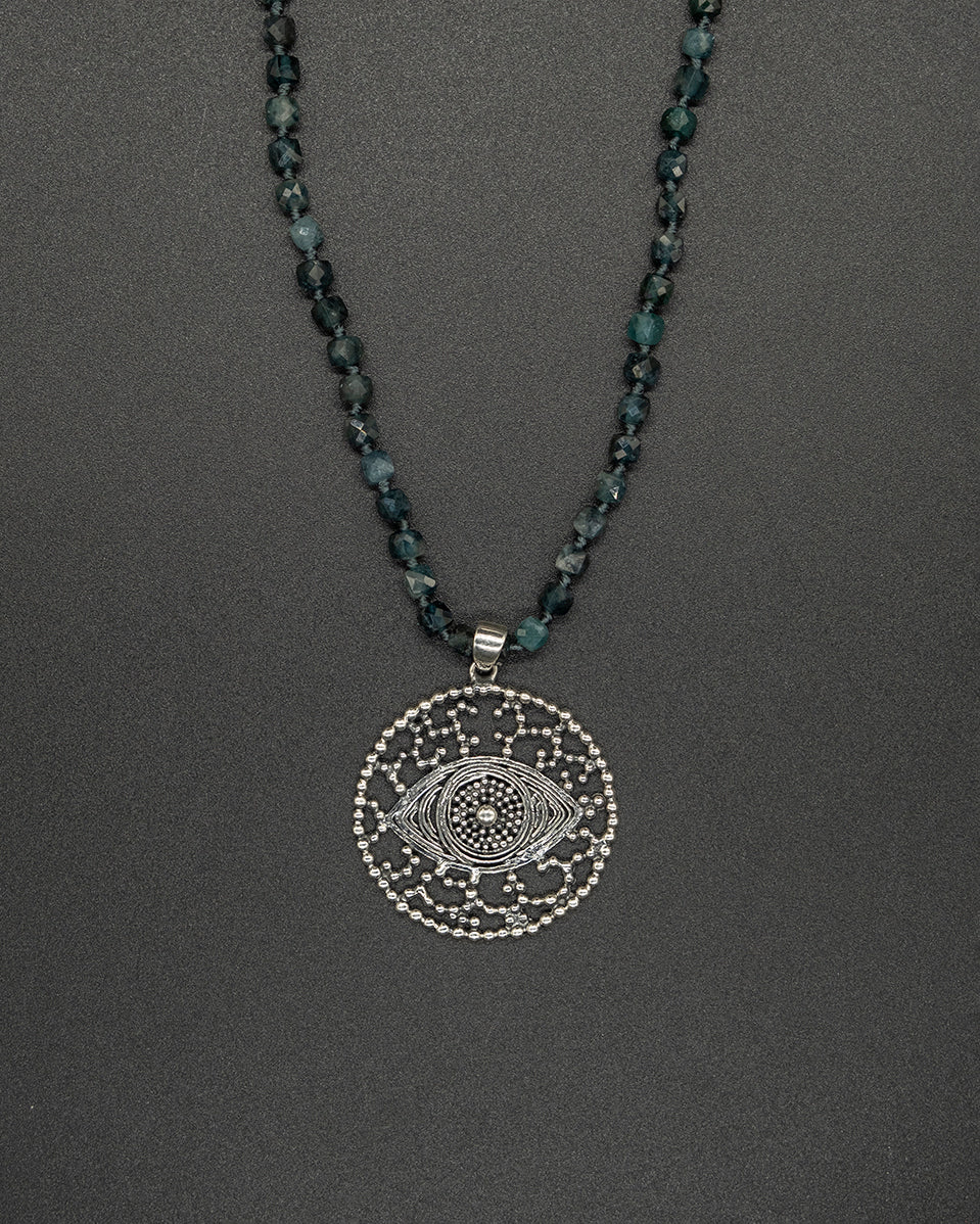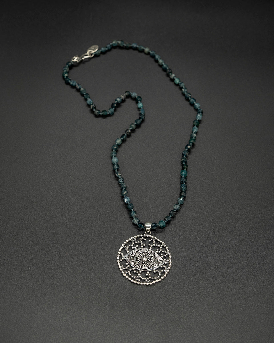 Embrace the protective symbolism of the evil eye. Our captivating silver evil eye is hand-made with intricate silver detailing. Suspended on a mesmerizing blue tourmaline chain.