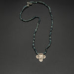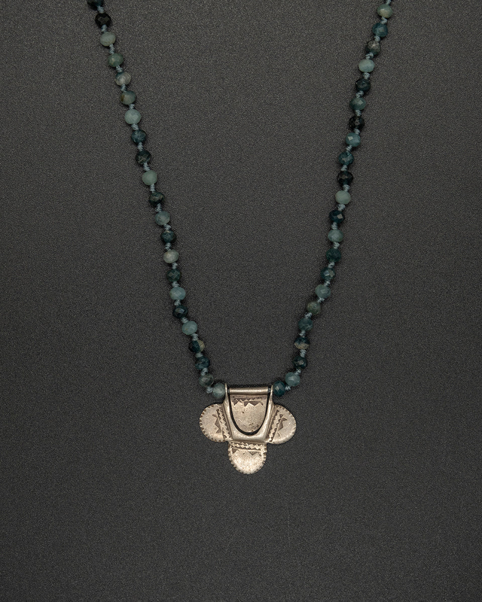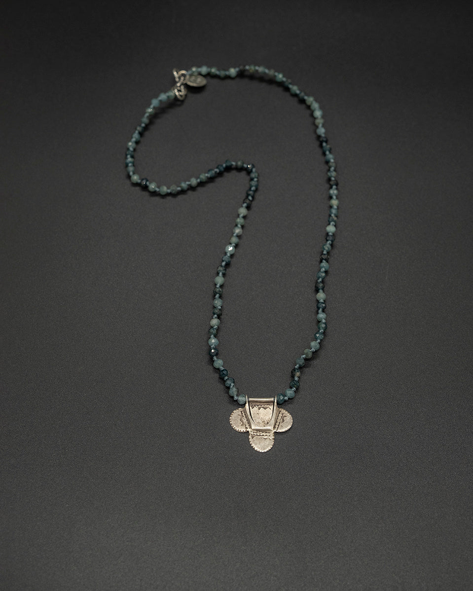 Add a subtle statement with this petite vintage Tuareg pendant. Rich in heritage detail, it is paired with a blue tourmaline chain that brings cool, refined tones and understated elegance.