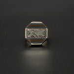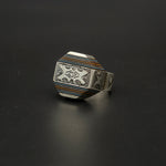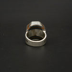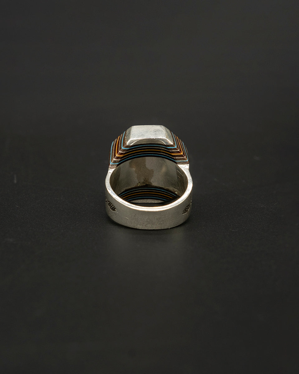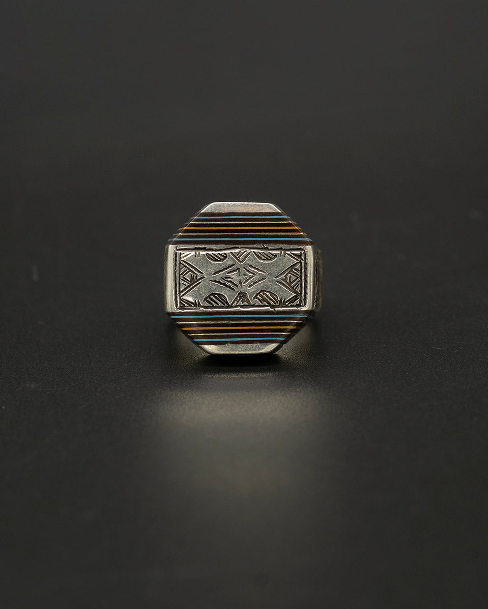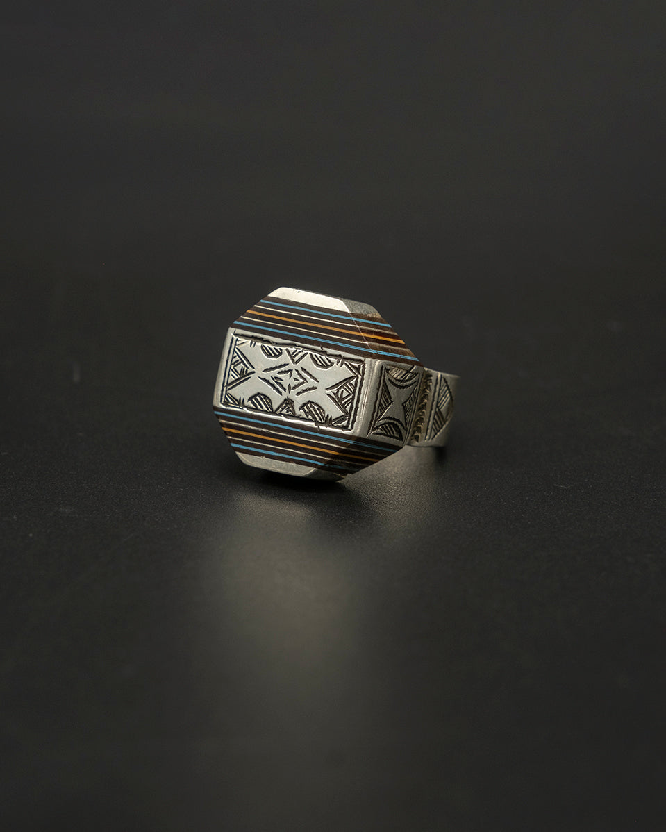 A unique Tuareg-inspired box ring crafted from warm brown wood with blue accents, framed in textured silver. Its compact box shape creates a bold, architectural look—an earthy, distinctive piece with tribal character.