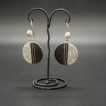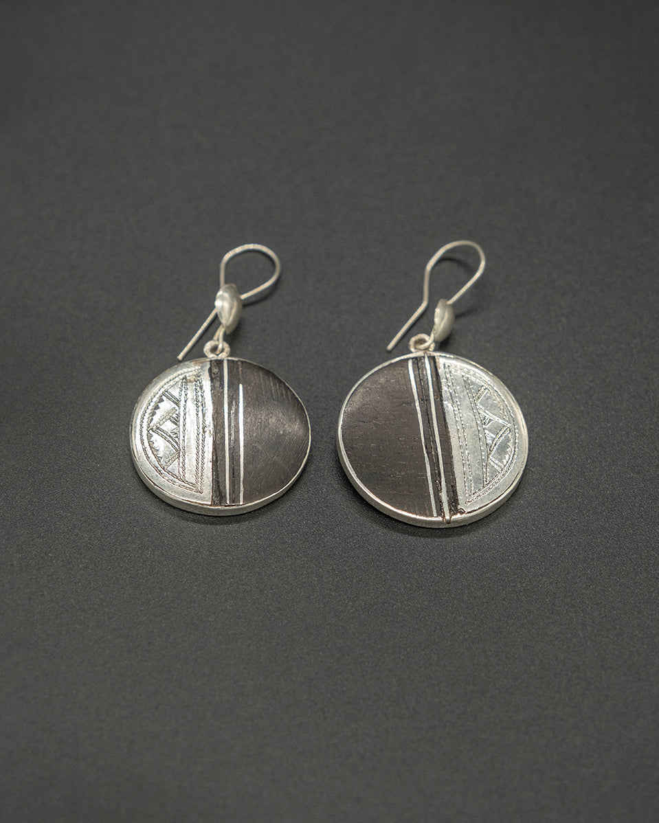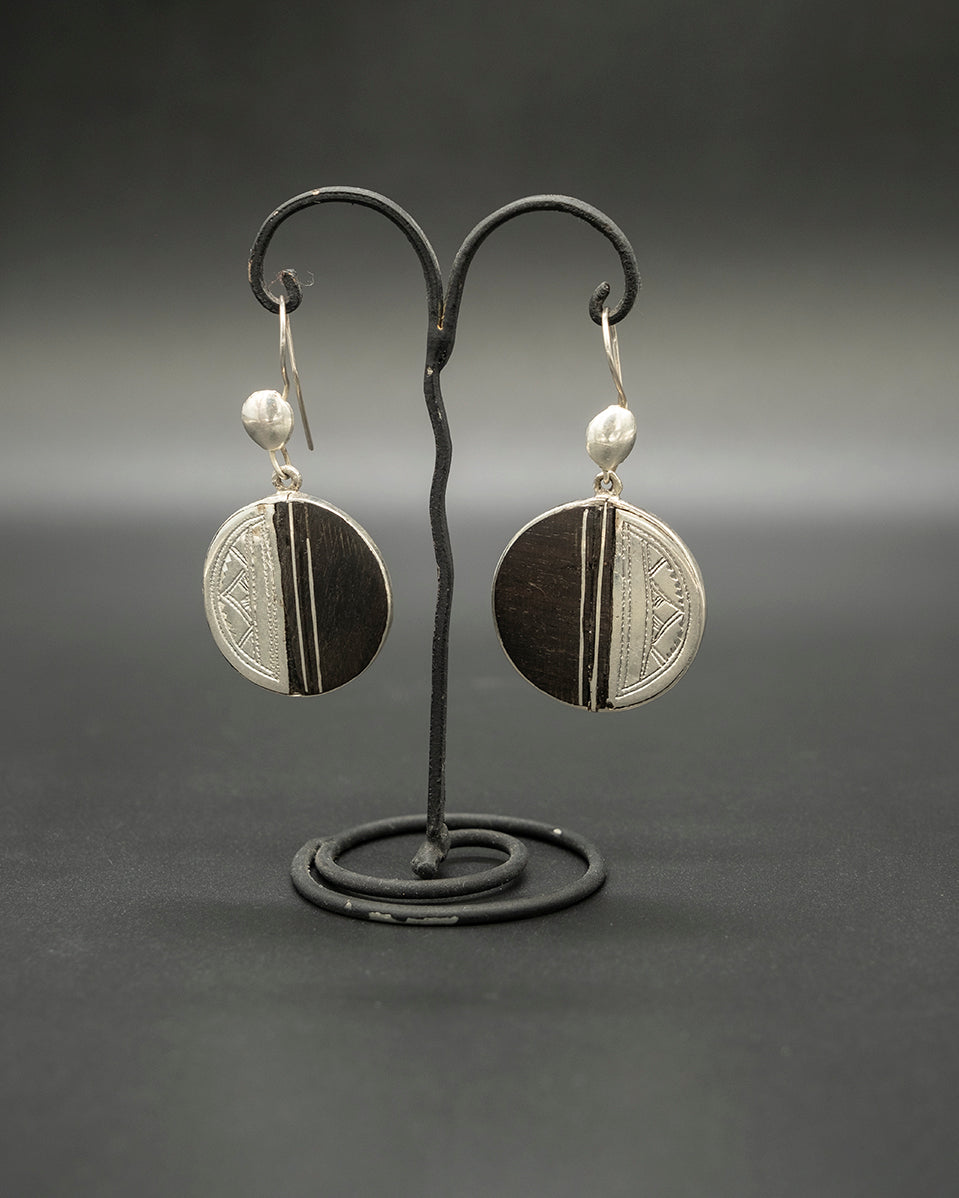 Distinctive earrings featuring wood split in half and set in Tuareg-style silver, creating a bold contrast of natural texture and tribal craftsmanship.