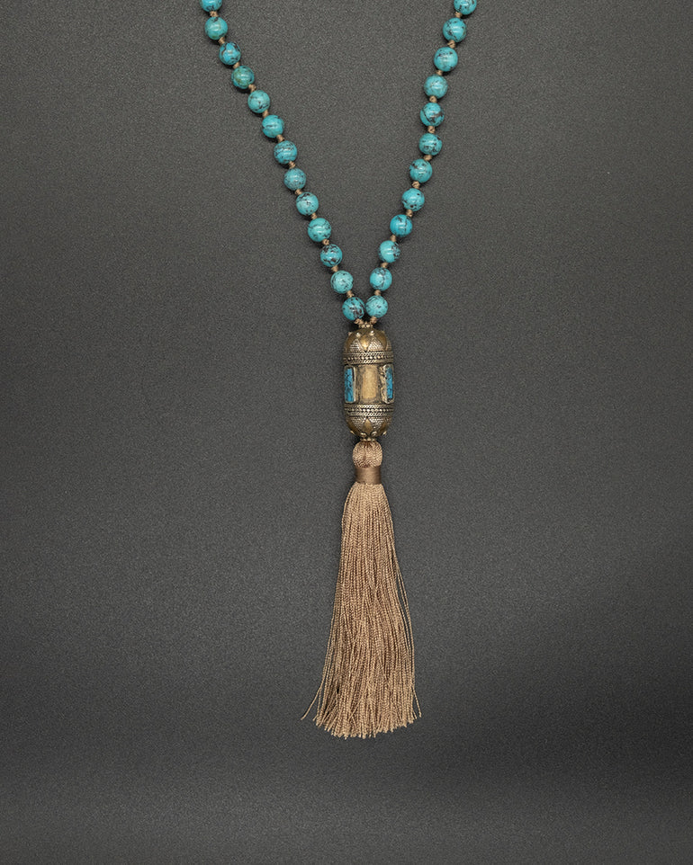 Lapis Afghan Brass Guru Bead paired with a 108 Turquoise chain — a striking mala that unites wisdom and protection. The deep blue lapis inspires truth and insight, while turquoise brings calm, balance, and ancient healing energy, all enriched by the warmth of handcrafted Afghan brass.