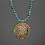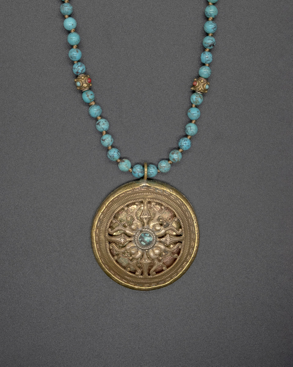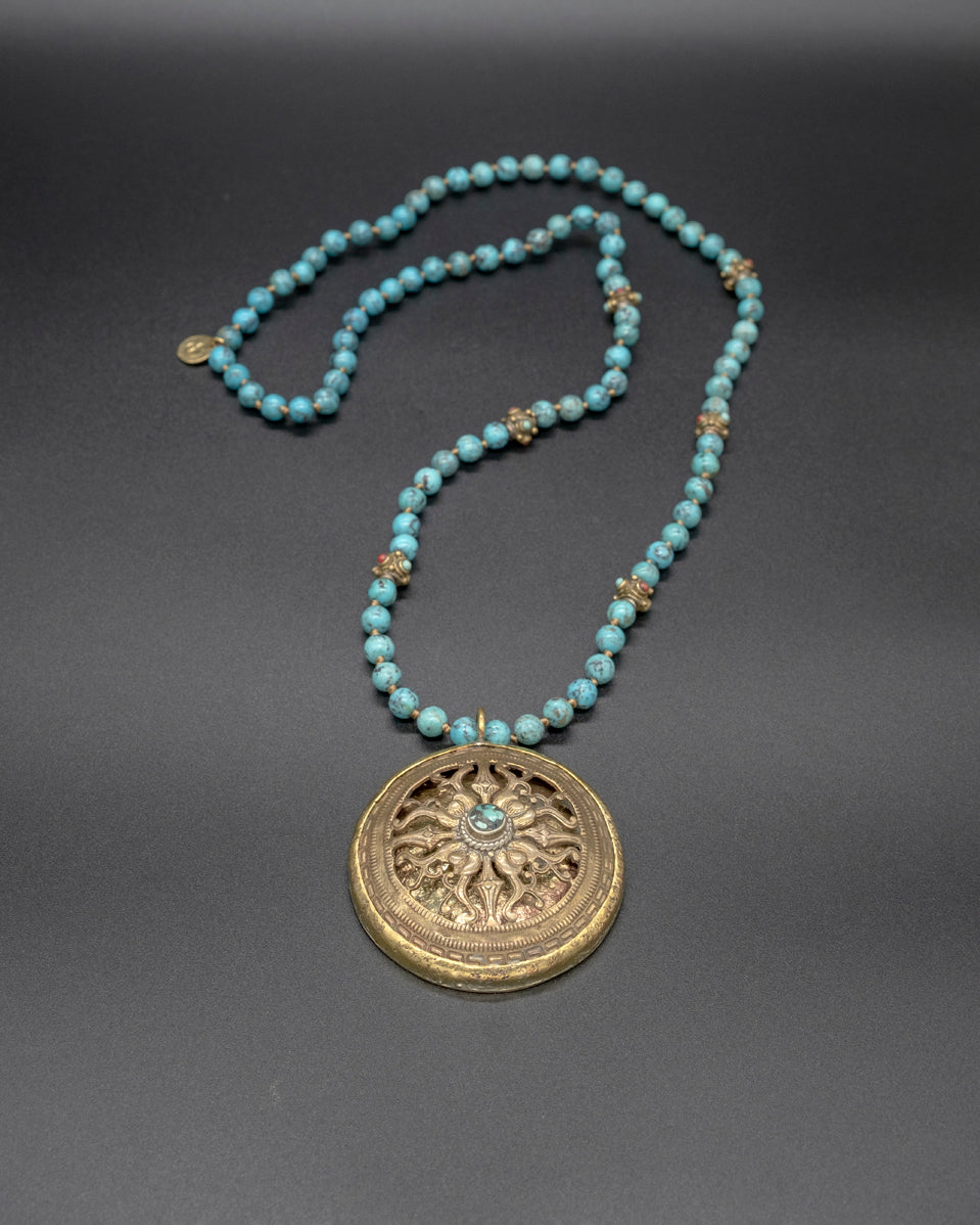 This symbol of compassion, the Vajra, is crafted into Tibetan brass and accented with turquoise in this unique pendant. This symbolic treasure is suspended from a hand-knotted chain of Arizona turquoise and vintage brass beads.