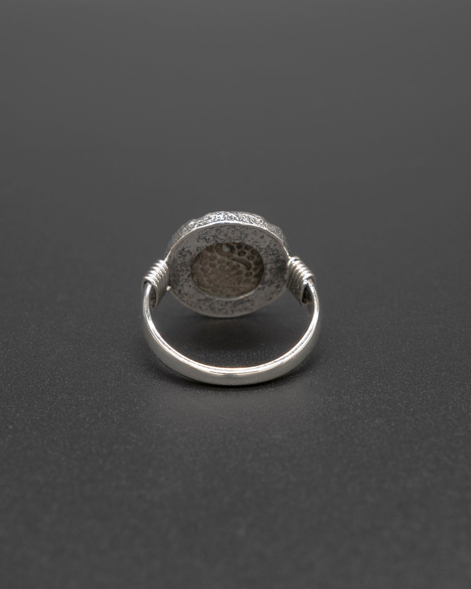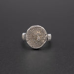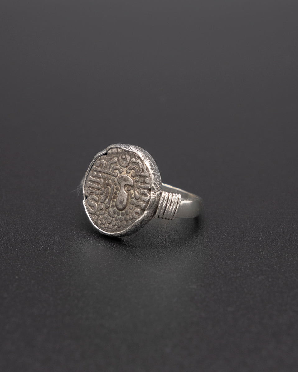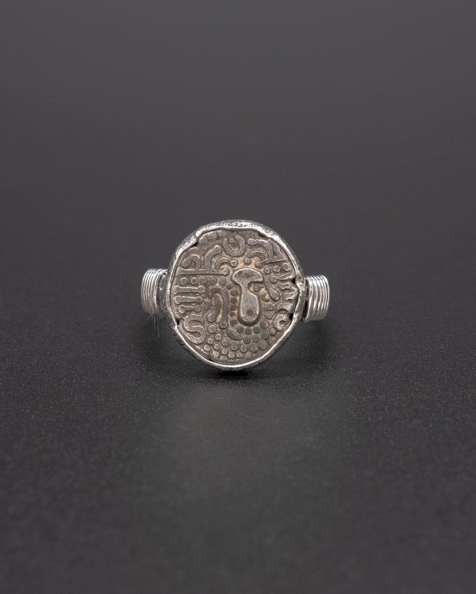 Add a little history and a touch of intrigue with this vintage silver Hindu shahi coin ring. Coiled in silver, this is a unique signet-style ring.
