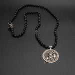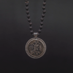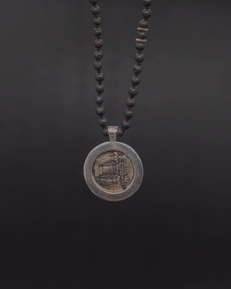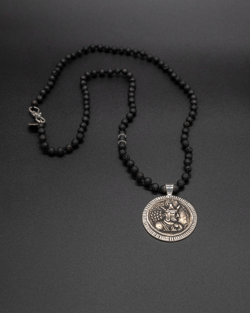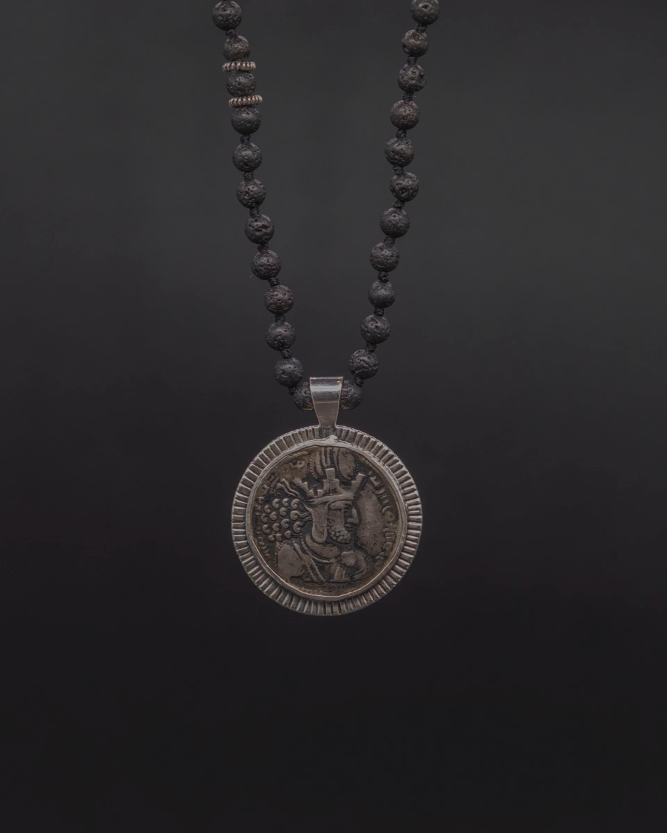 This unique pendant features an authentic Persian coin from the Sasani era, encased in a delicate hand-engraved silver frame. Suspended from a hand-knotted lava stone chain, the necklace is as beautiful as it is distinctive. Perfect for those with a passion for history.