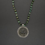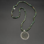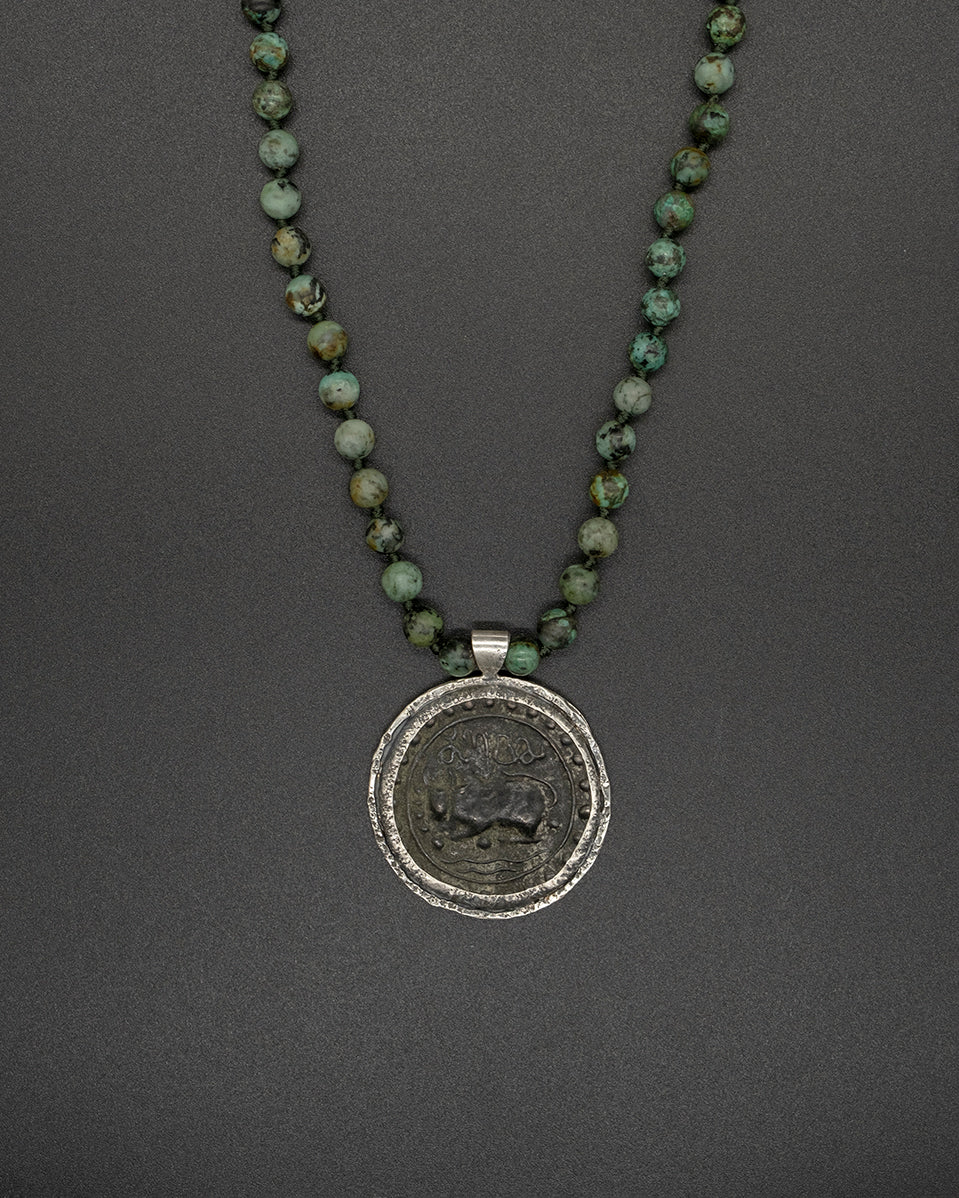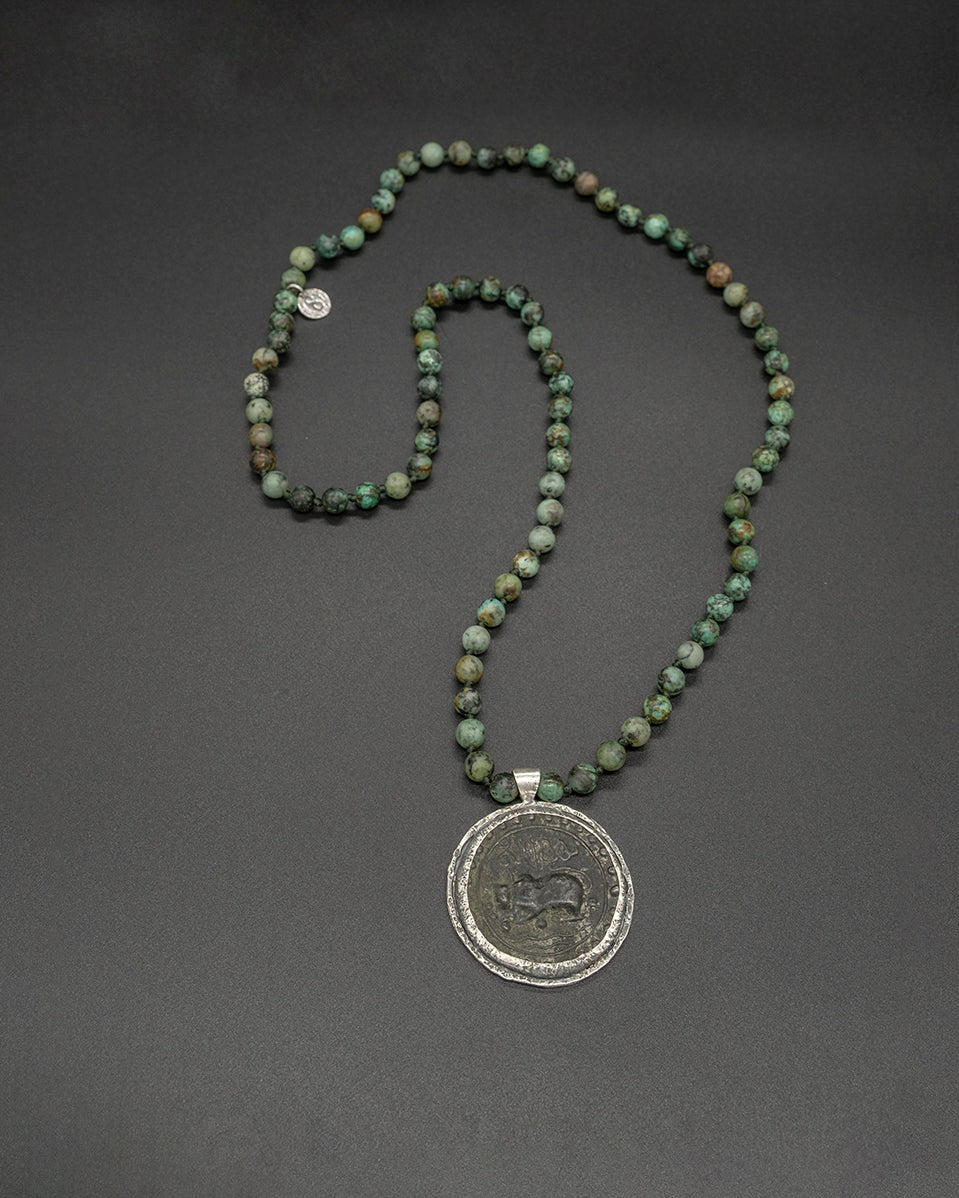 This vintage Tibetan coin amulet evokes a feeling of an ancient culture, coupled with a modern edge! The vintage coin is framed in textured silver, and it is masterfully crafted with a hand-knotted African turquoise necklace.