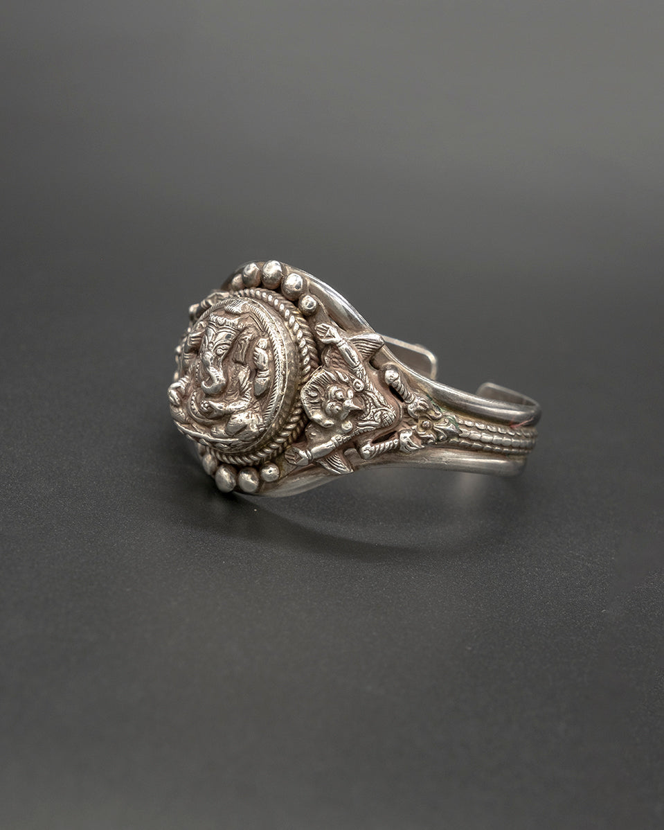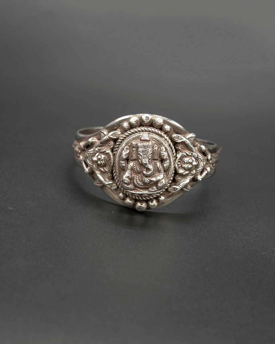Embrace the essence of wisdom of Ganesha, with this cuff bracelet. This intricately designed piece shines bright in sterling silver, showcasing the iconic Ganesha symbol – a representation of ancient philosophy representing the removal of obstacles. Adjustable for a comfortable fit.