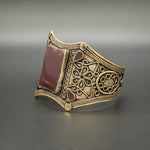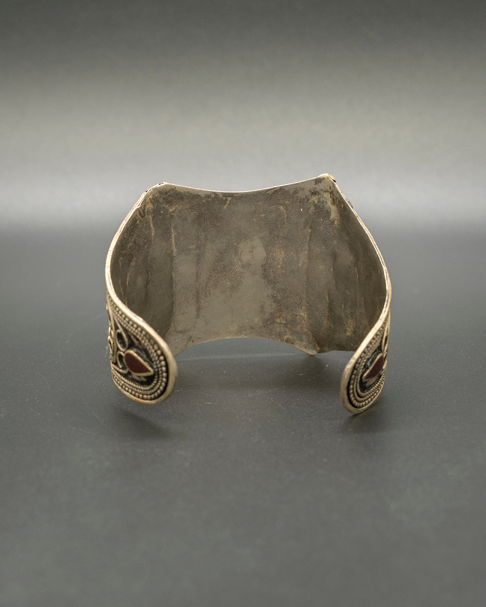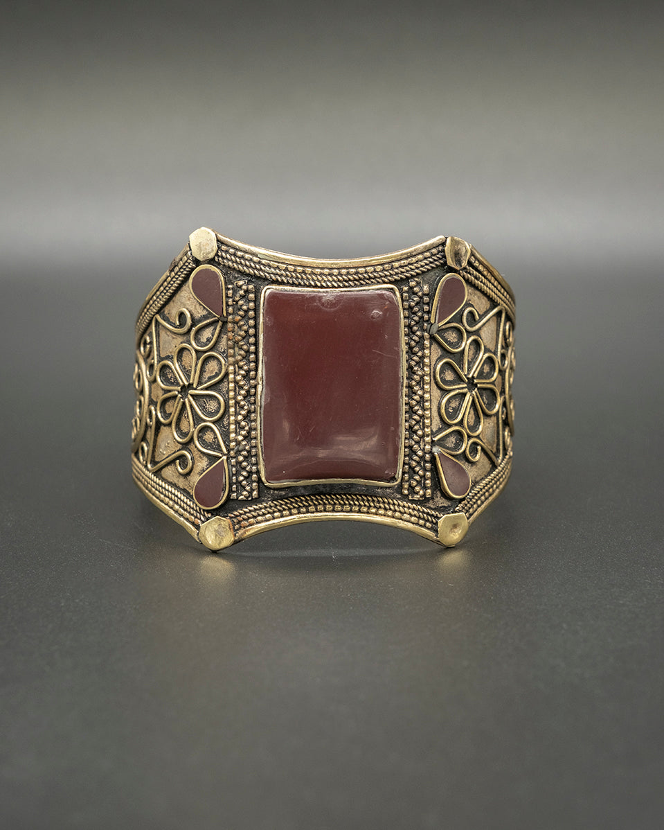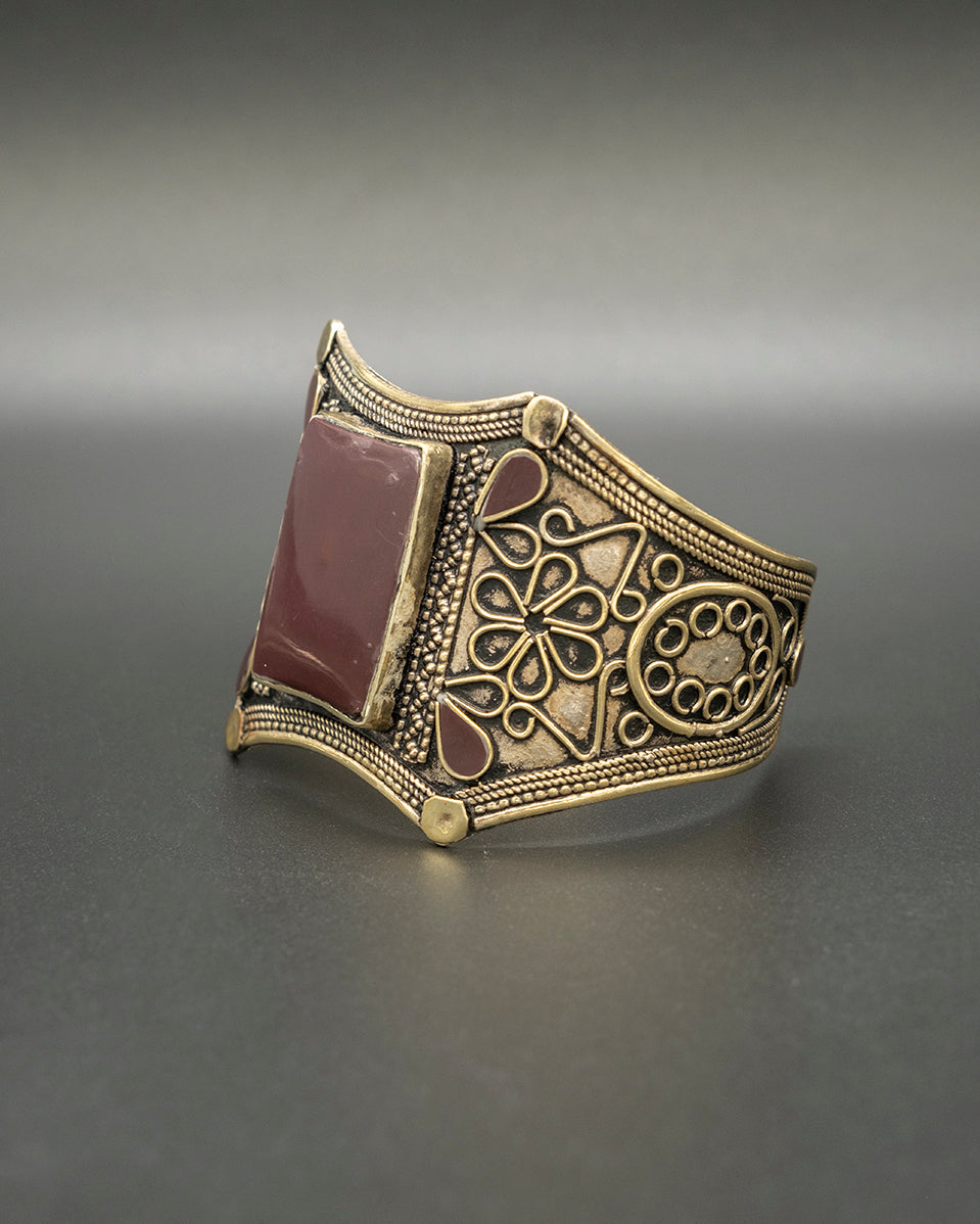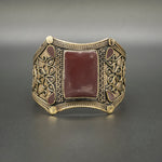 This stunning piece showcases the rich heritage of traditional tribal jewelry, crafted from high-quality antique brass and adorned with a vibrant carnelian stone. The intricate detailing adds a unique touch, making this vintage cuff from Turkmenistan not just a bracelet, but a true work of art that tells a story.