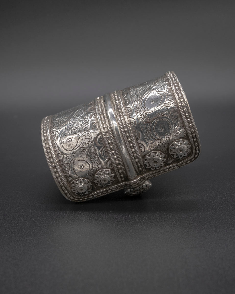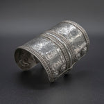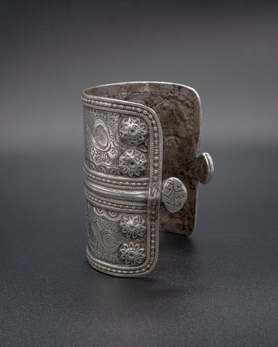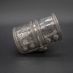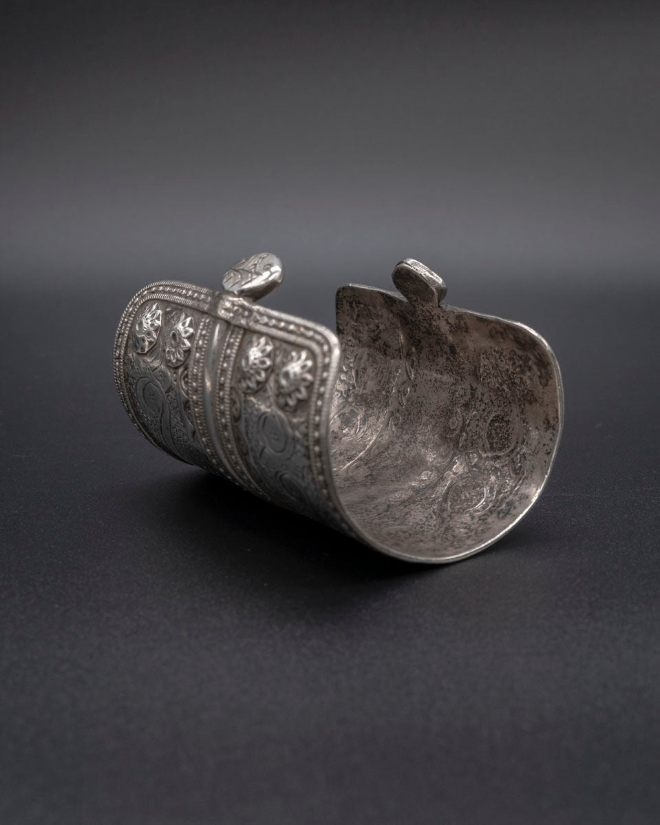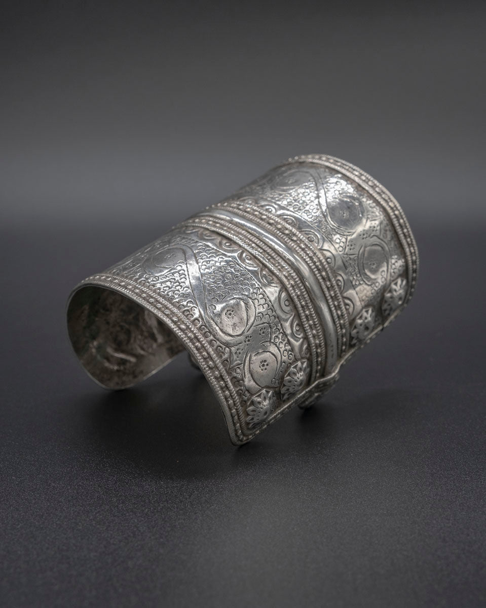 Make a statement with our exquisite Turkman Cuff, a true testament to the unparalleled beauty of traditional tribal jewelry. Meticulously crafted from high-quality sterling silver and featuring intricate hand-engraved detailing, this vintage cuff from Turkmenistan is a true work of art.
