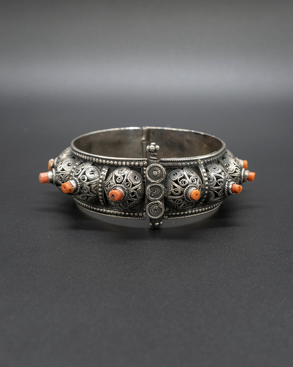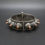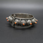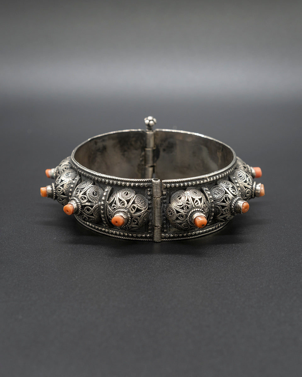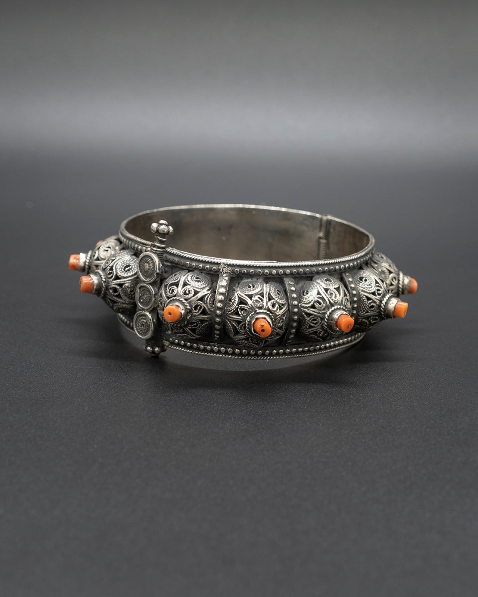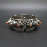Step into the realm of Yemen craftsmanship with this vintage handmade cuff. With a beautifully detailed flower design, this piece is a testament to the skills and artistry of the makers. The warmth of coral combined with the intricate floral patterns will leave an unforgettable impression.